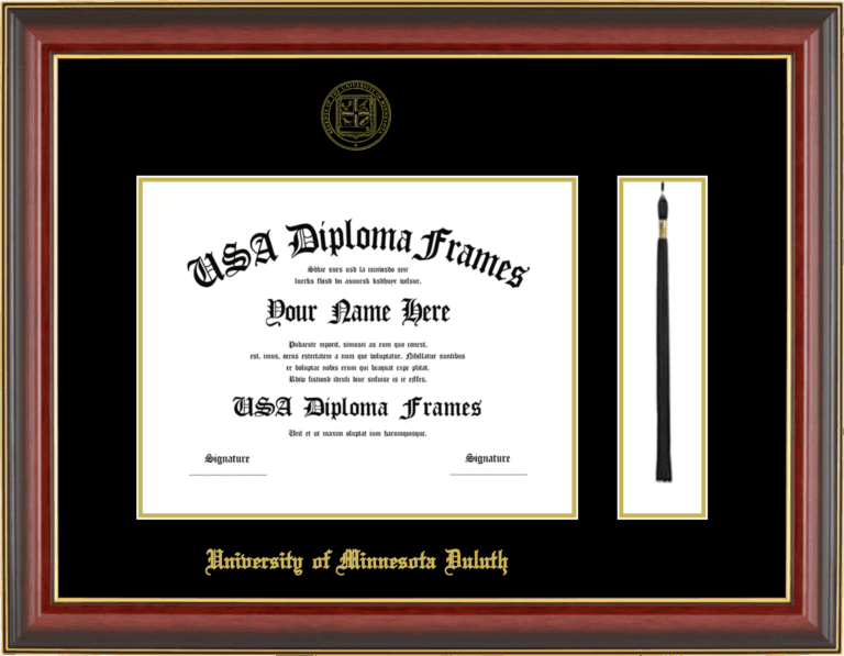 University of Minnesota Duluth Diploma Frame with Tassel – Cherry Mahogany Gold Trim Glossy – Black and Gold Mat