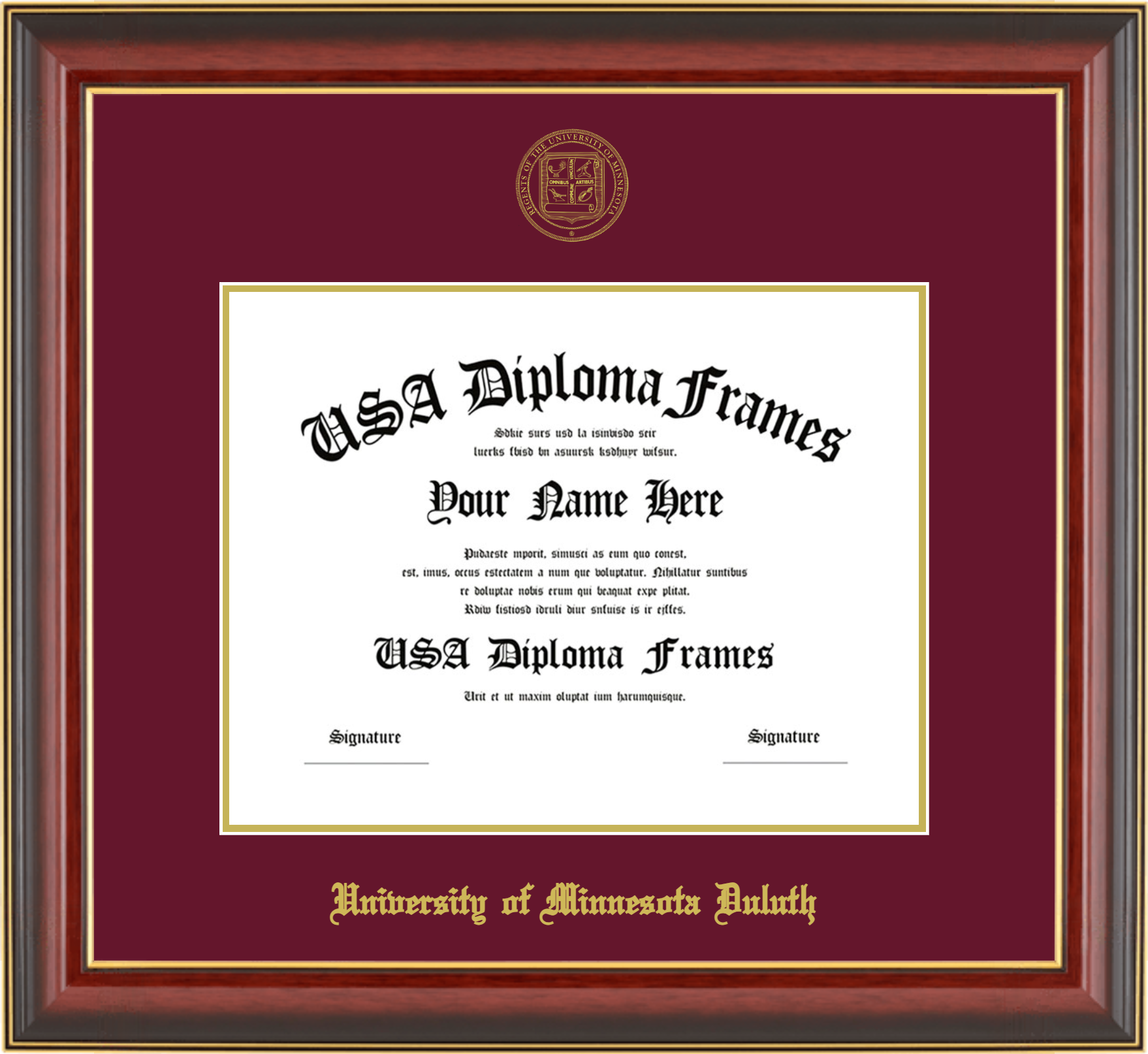 University of Minnesota Duluth – Single Horizontal Document ( Diploma ) – Cherry Mahogany Gold Trim Glossy – Maroon Mat – Gold Accent Mat – With Seal(University Seal Gold) – With Gold Embossing (University of Minnesota Duluth)