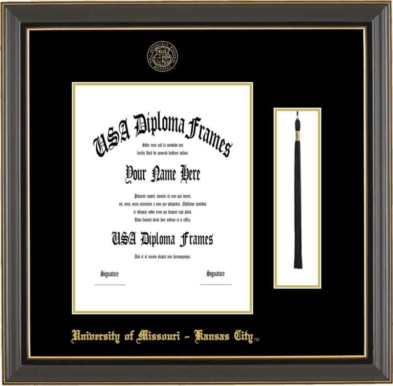 University of Missouri Kansas City Diploma Frame with Tassel – UMKC – Black Gold Trim Glossy – Black and Gold Mat