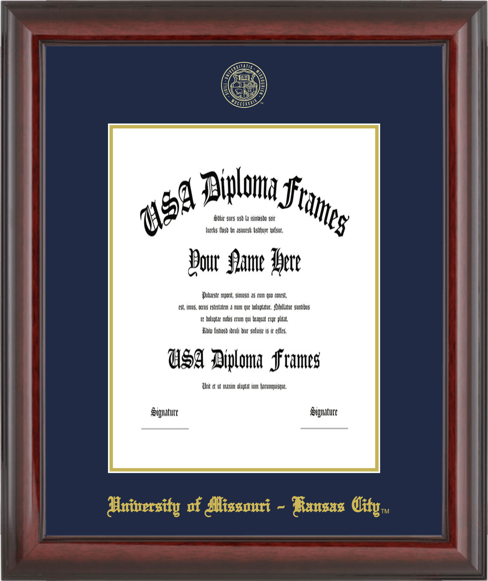 University of Missouri – Kansas City – Single Horizontal Document ( Diploma ) – Cherry Mahogany Glossy – Navy Mat – Gold Accent Mat – With Seal(University Seal Gold) – With Gold Embossing (University of Missouri – Kansas City)