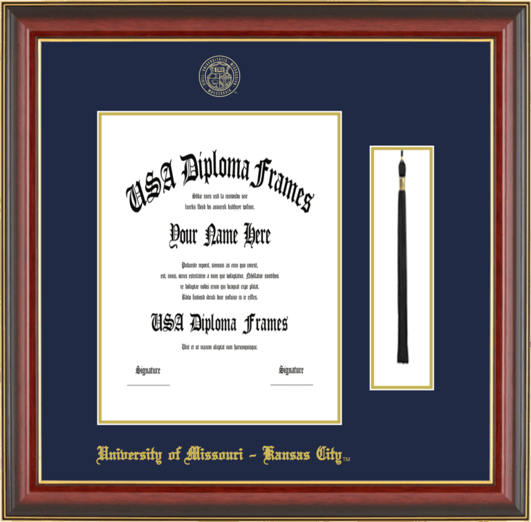 University of Missouri Kansas City Diploma Frame with Tassel – UMKC – Cherry Mahogany Gold Trim Glossy – Navy and Gold Mat