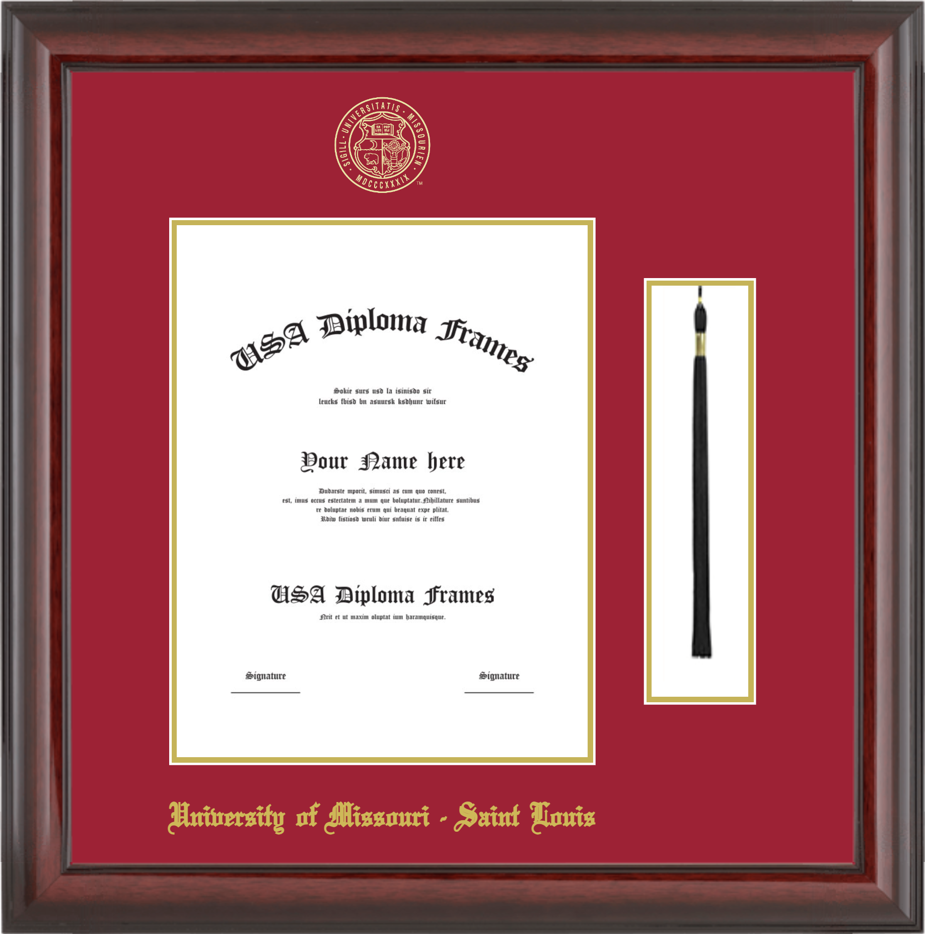 University of Missouri – Saint Louis Diploma Frame with Tassel – Cherry Mahogany Glossy – Crimson and Gold Mat