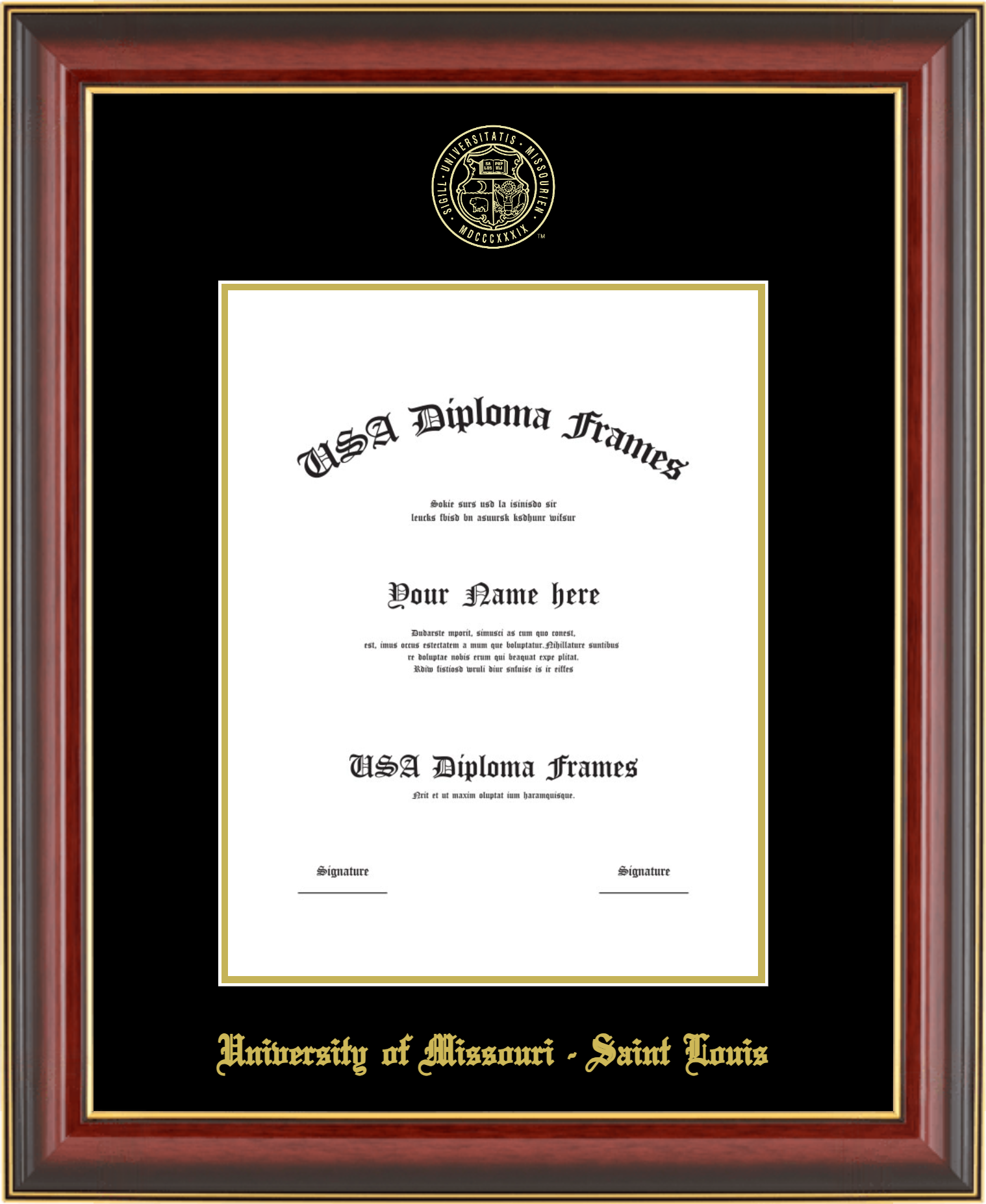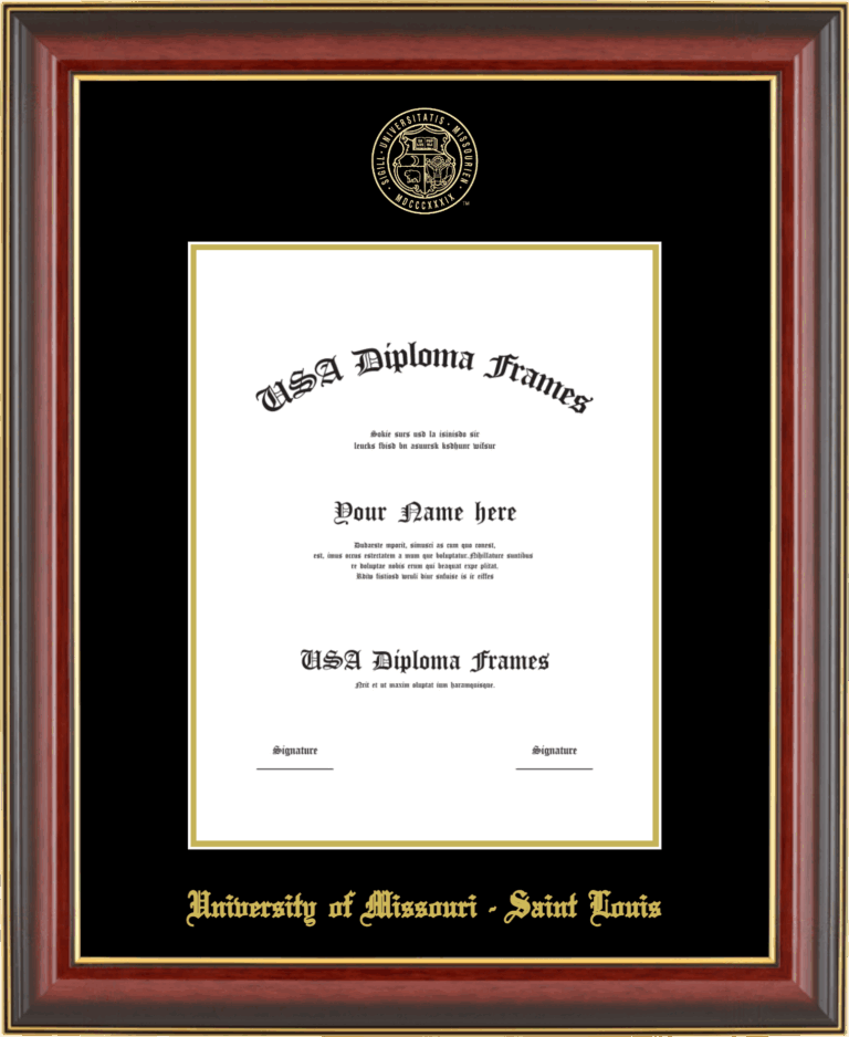 University of Missouri – Saint Louis Diploma Frame – Cherry Mahogany Gold Trim Glossy – Black and Gold Mat