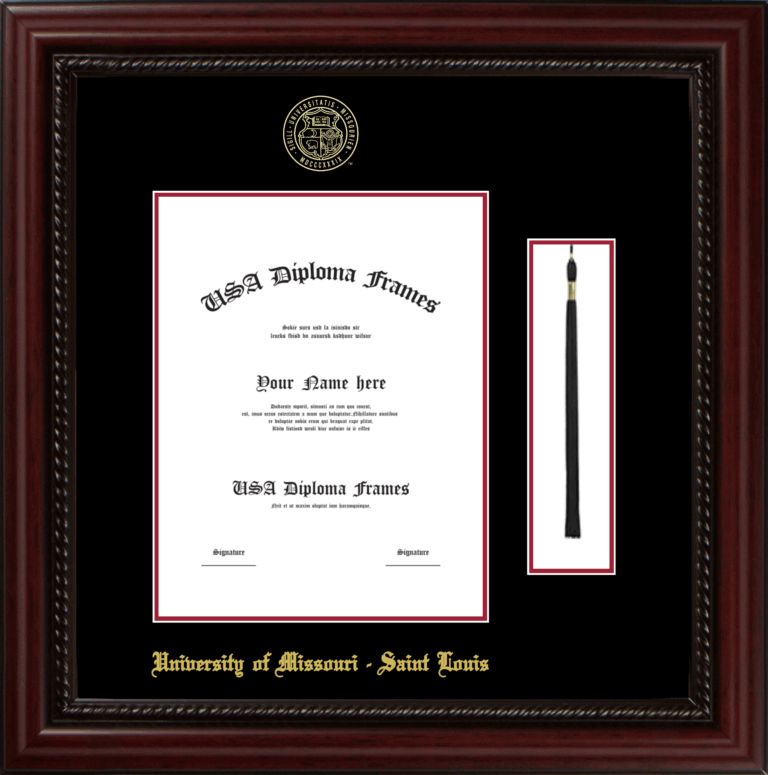 University of Missouri – Saint Louis Diploma Frame with Tassel – Executive Cherry Rope – Black and Crimson Mat