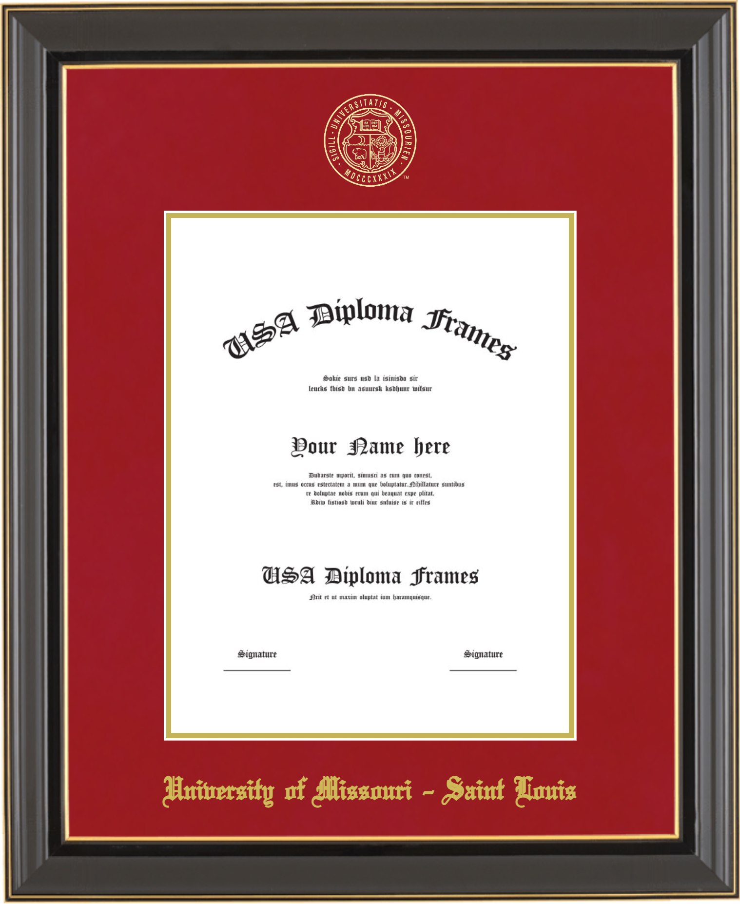University of Missouri – Saint Louis – Single Vertical Document ( Diploma ) – Black Gold Trim Glossy – Crimson Mat – Gold Accent Mat – With Seal(University Seal Gold) – With Gold Embossing (University of Missouri – Saint Louis)
