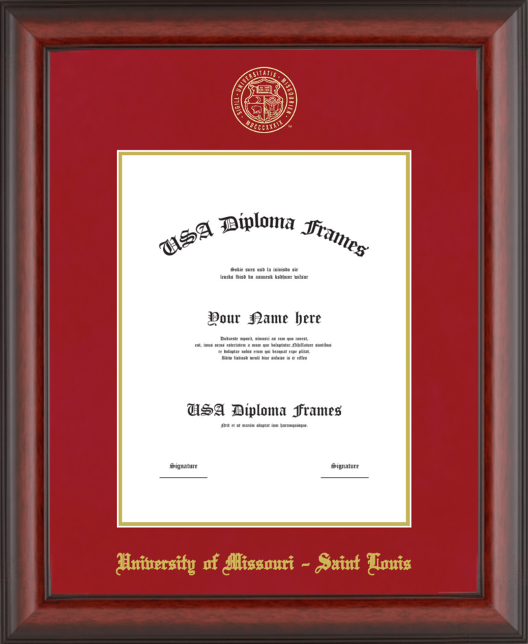 University of Missouri – Saint Louis – Single Vertical Document ( Diploma ) – Cherry Mahogany Matte – Crimson Mat – Gold Accent Mat – With Seal(University Seal Gold) – With Gold Embossing (University of Missouri – Saint Louis)