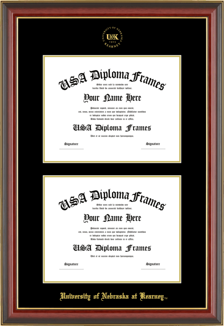 University of Nebraska at Kearney Double Diploma Frame – Double Document – Cherry Mahogany Gold Trim Glossy – Black and Gold Mat