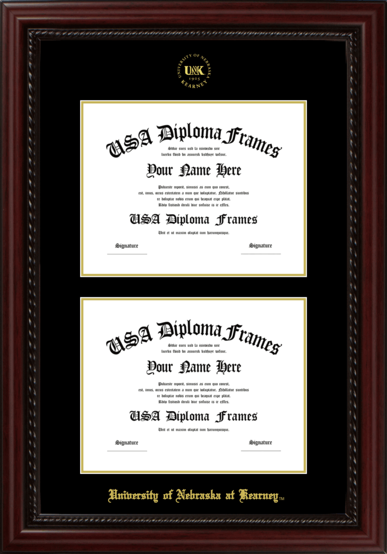 University of Nebraska at Kearney Double Diploma Frame – Double Document – Executive Cherry Rope – Black and Gold Mat