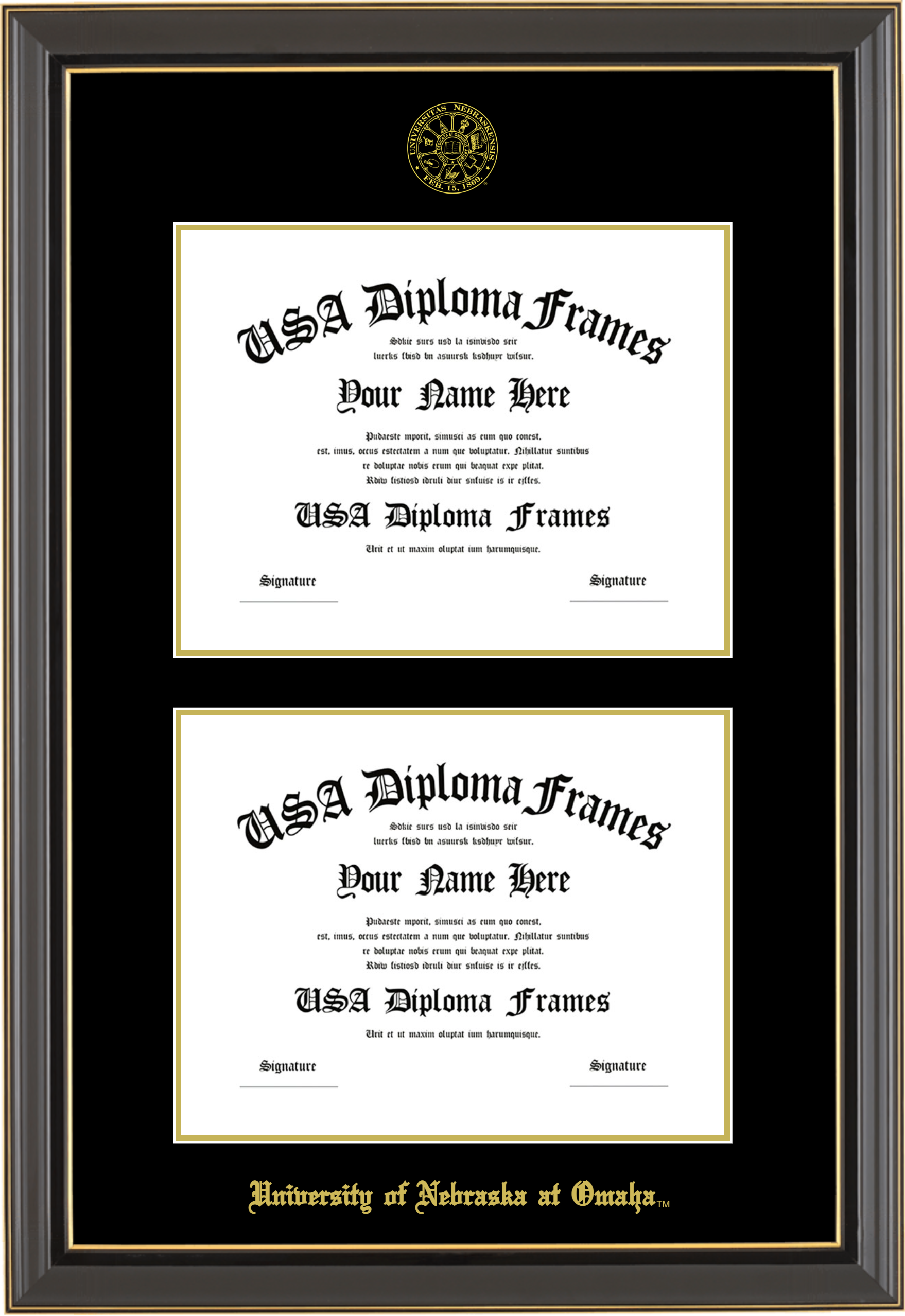 University of Nebraska at Omaha UNO Double Diploma Frame – Double Document – Black Gold Trim Glossy – Black and Gold Mat