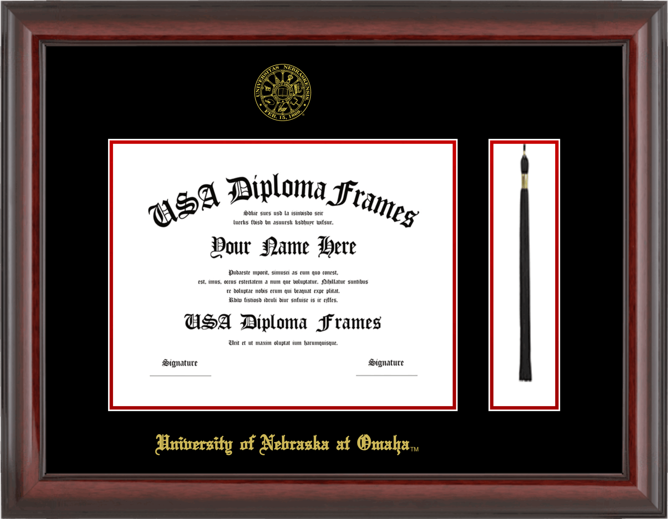 University of Nebraska at Omaha – Single Horizontal Document ( Diploma ) – Cherry Mahogany Glossy – Black Mat – Red Accent Mat – With Tassel(Default) – With Seal(University Seal Gold) – With Gold Embossing (University of Nebraska at Omaha)