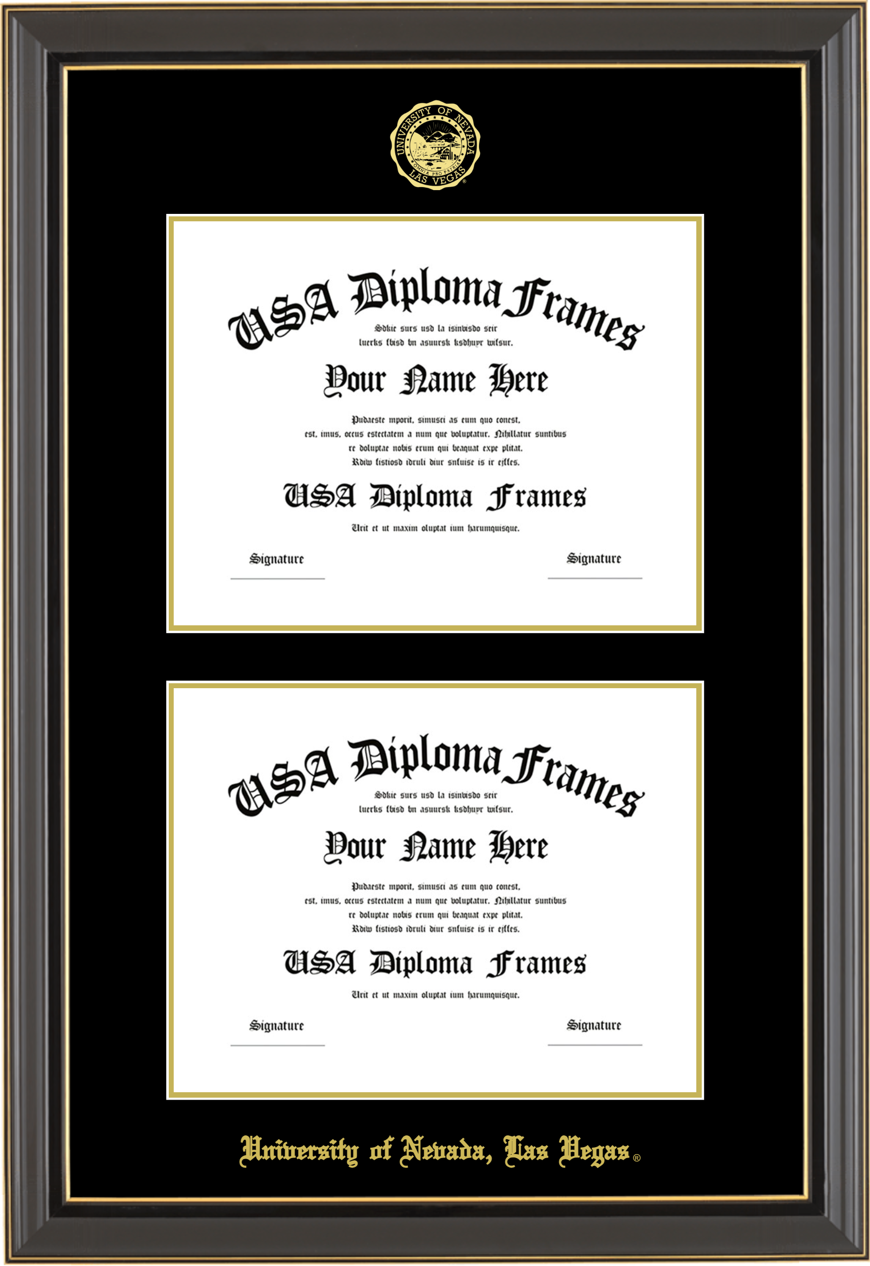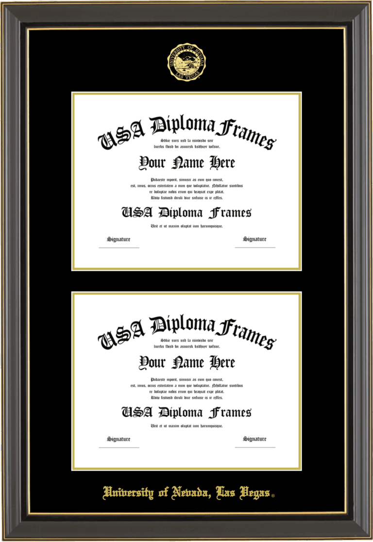 University of Nevada, Las Vegas UNLV Double Diploma Frame – Double Document – Black Gold Trim Glossy – Black and Gold Mat
