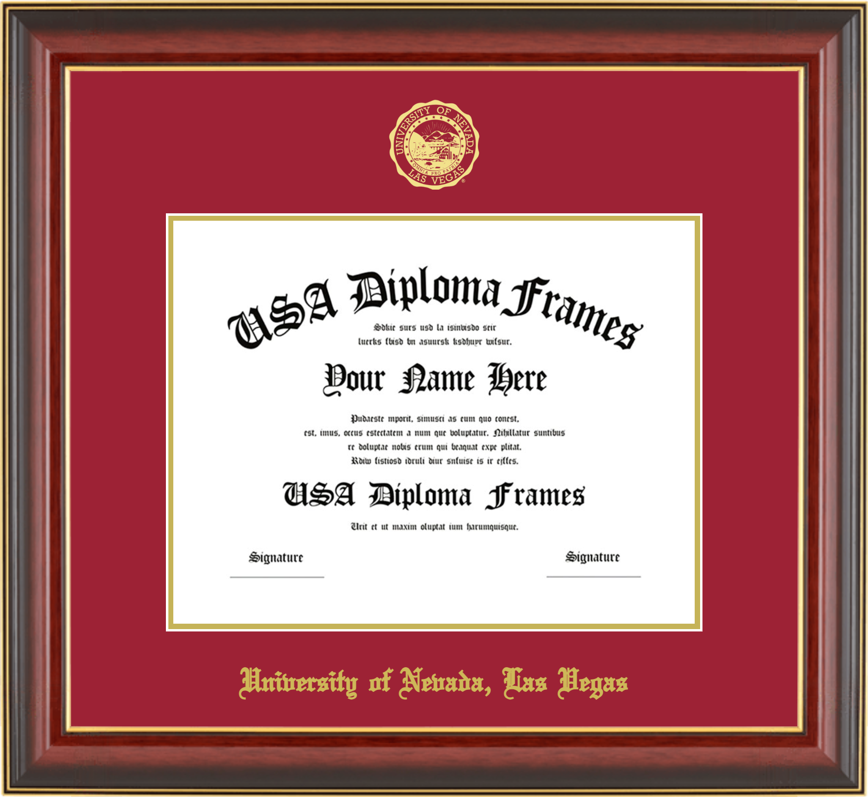 University of Nevada, Las Vegas Diploma Frame – UNLV Diploma Frame – Cherry Mahogany Gold Trim Glossy – Crimson and Gold Mat