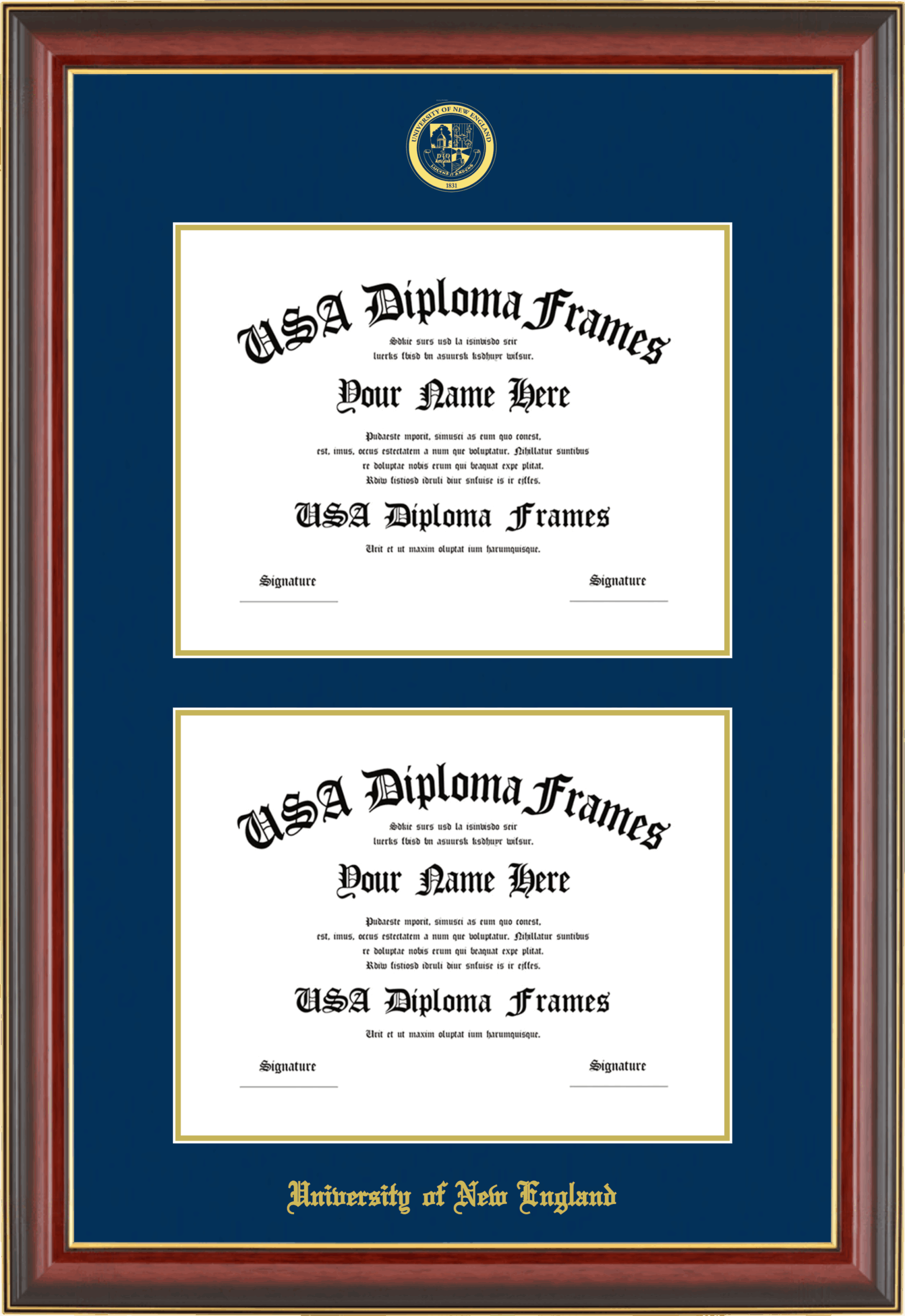 University of New England Double Diploma Frame – Double Document – Cherry Mahogany Gold Trim Glossy – Navy and Gold Mat