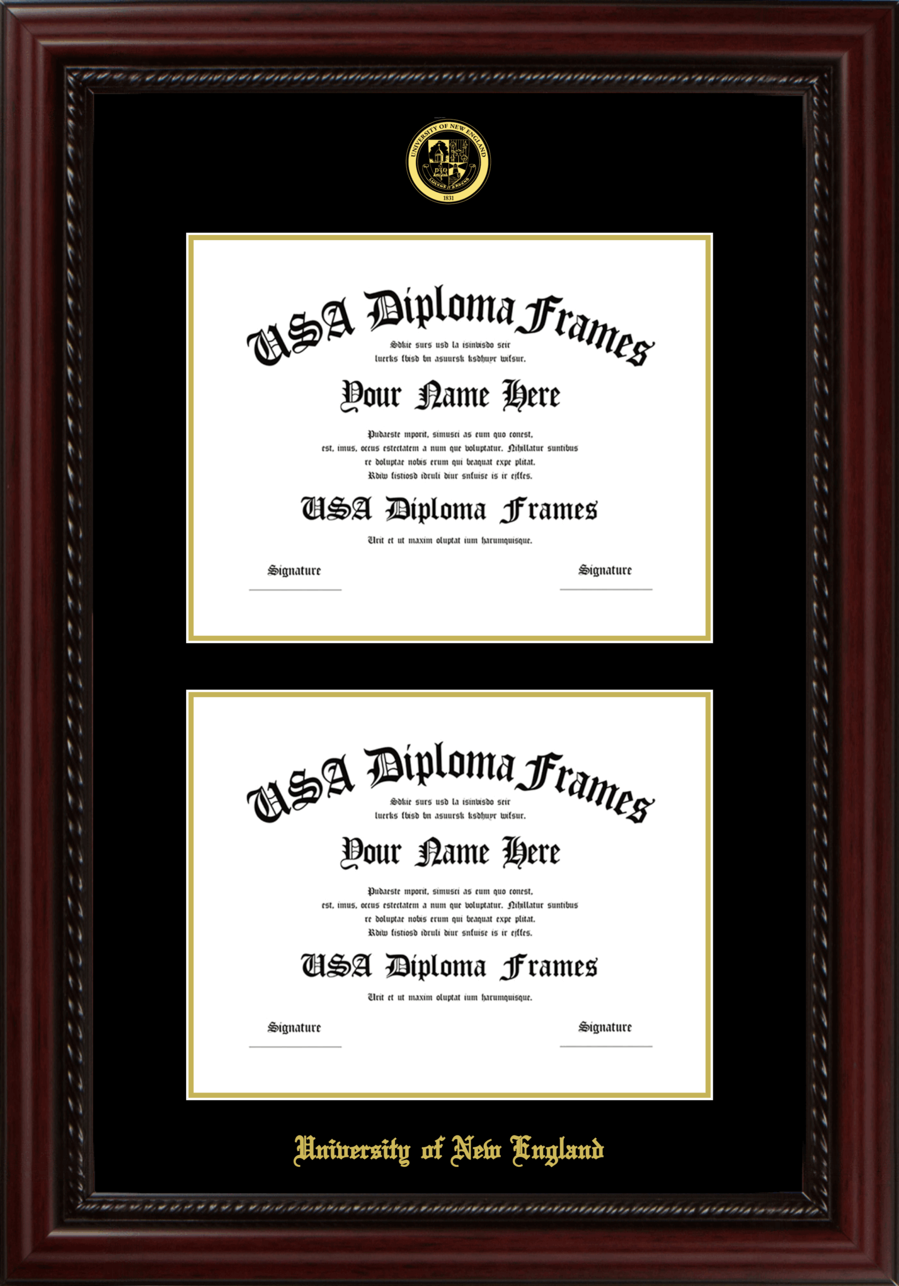 University of New England Double Diploma Frame – Double Document – Executive Cherry Rope – Black and Gold Mat