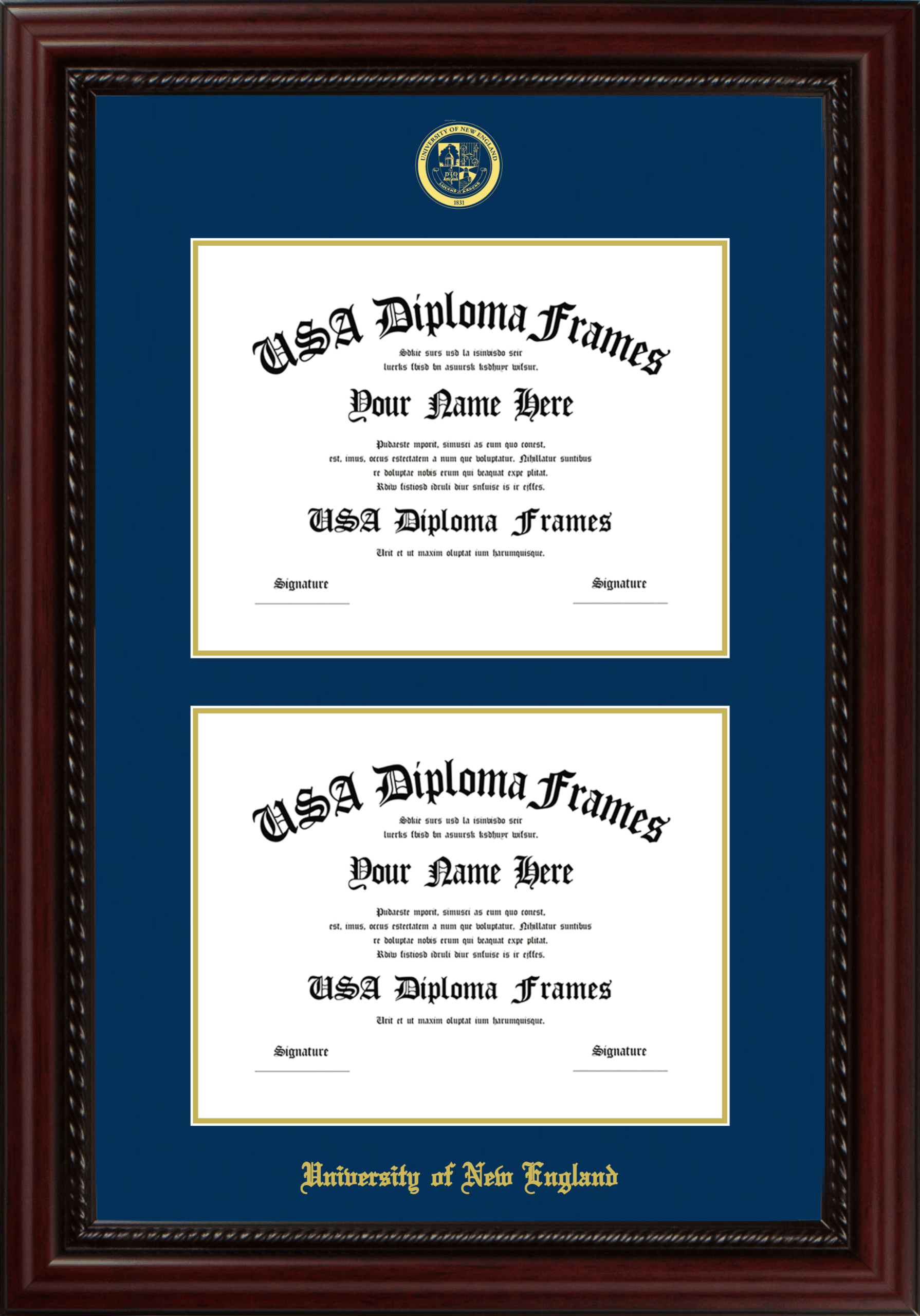 University of New England Double Diploma Frame – Double Document – Executive Cherry Rope – Navy and Gold Mat