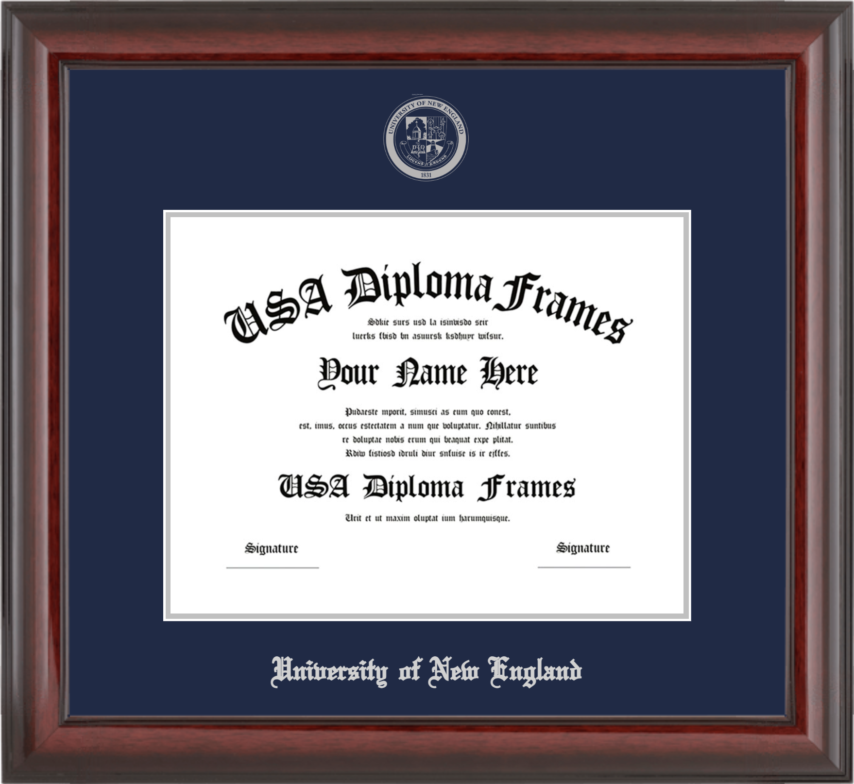 University of New England – Single Horizontal Document ( 8 1/2″x11″ ) – Cherry Mahogany Glossy – Navy Mat – Silver Accent Mat – With Seal(University Seal Silver) – With Silver Embossing (University of New England)