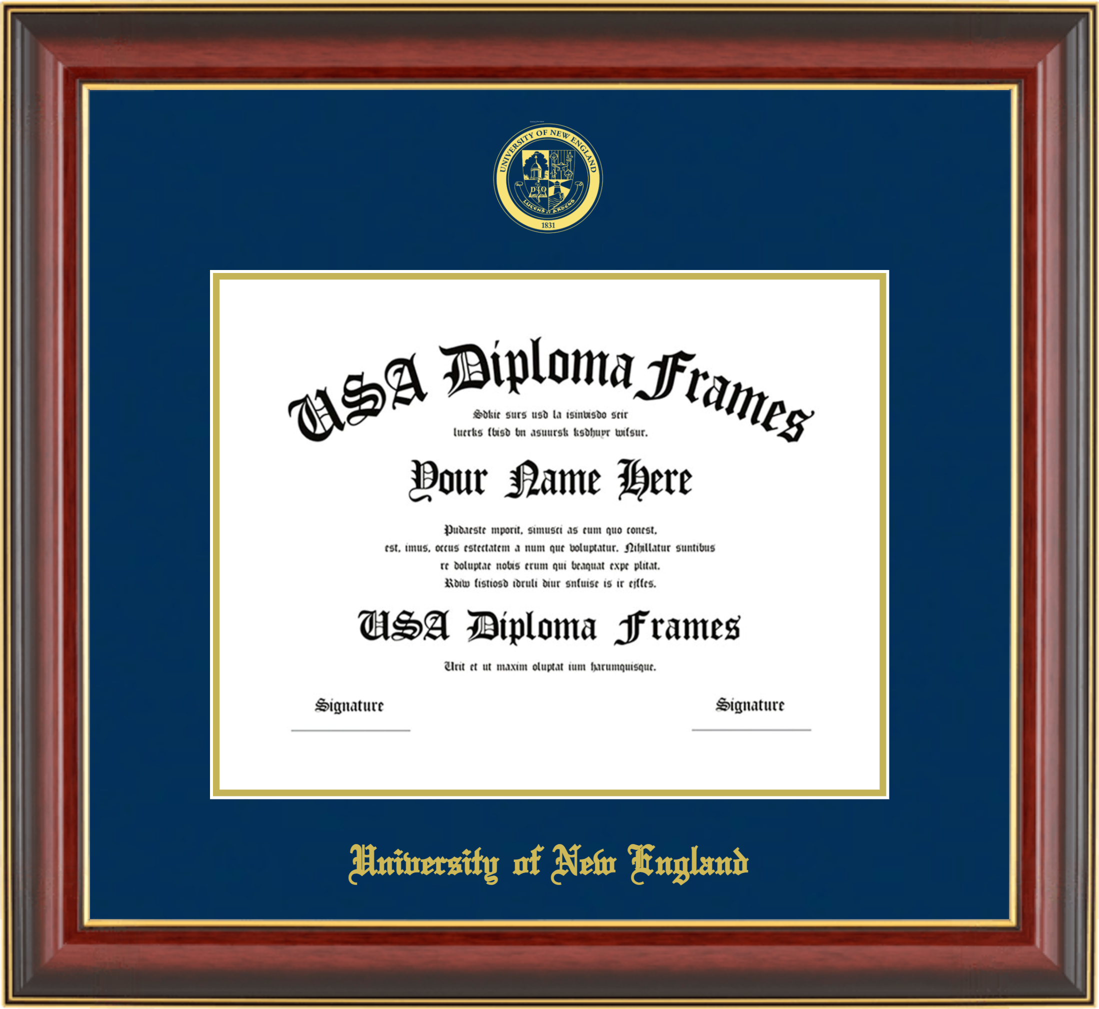 University of New England Diploma Frame – Cherry Mahogany Gold Trim Glossy – Navy and Gold Mat