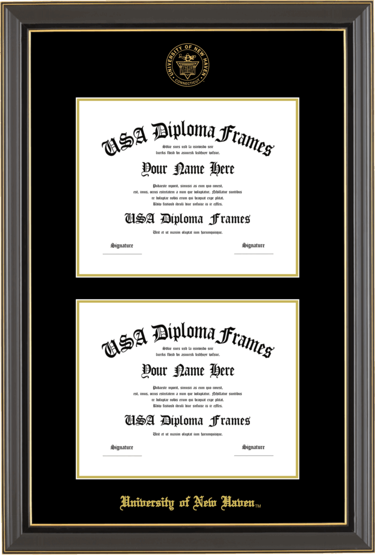 University of New Haven Double Diploma Frame – Double Document – Black Gold Trim Glossy – Black and Gold Mat