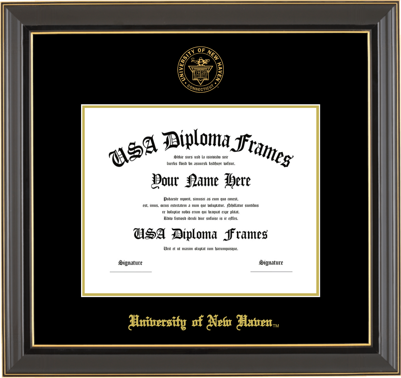 University of New Haven Diploma Frame – Black Gold Trim Glossy – Black and Gold Mat