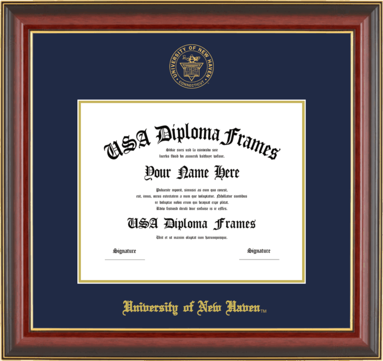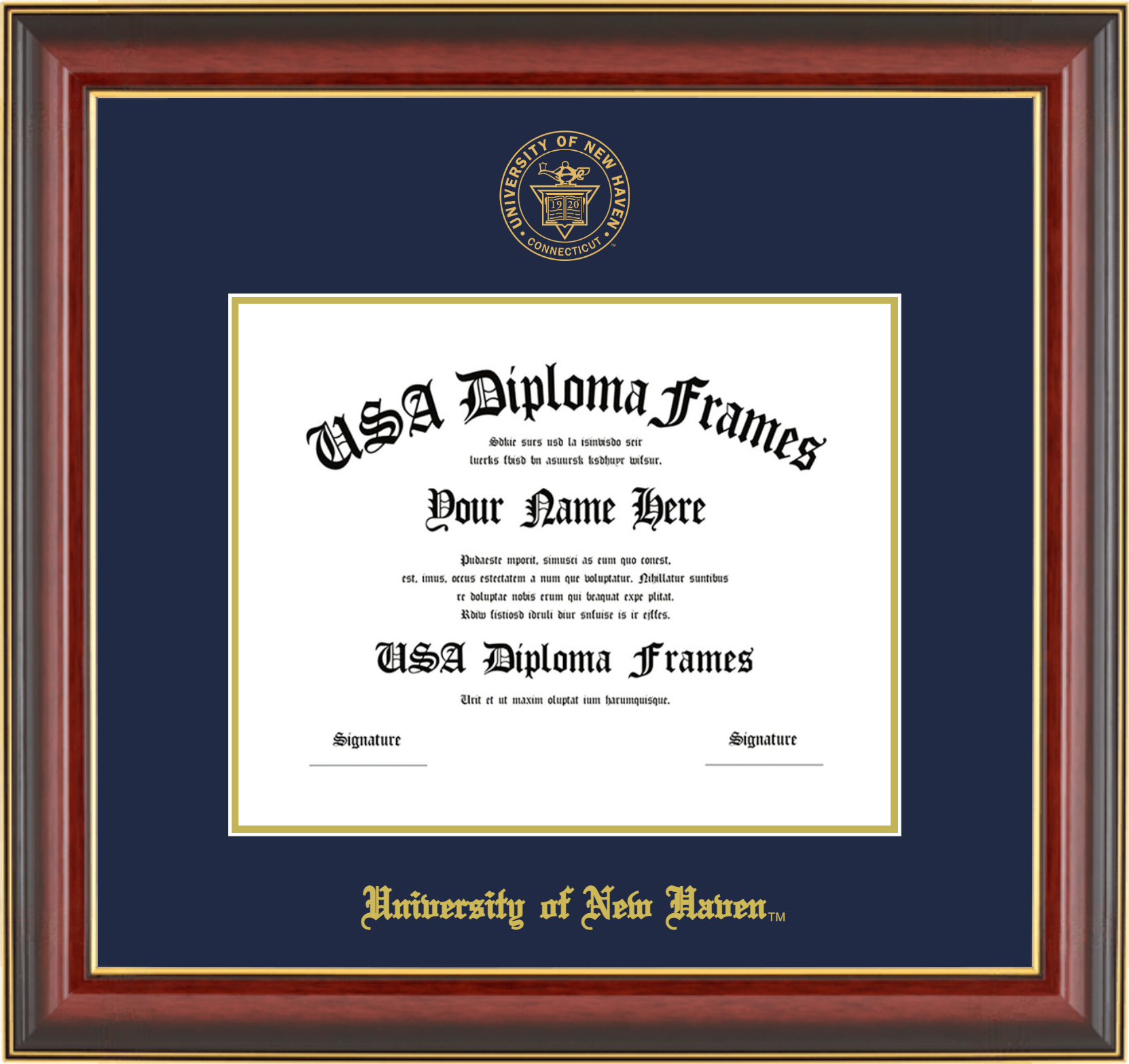 University of New Haven Diploma Frame – Cherry Mahogany Gold Trim Glossy – Navy and Gold Mat