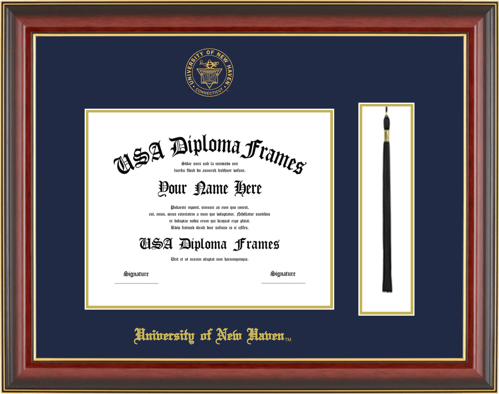 University of New Haven Diploma Frame with Tassel – Cherry Mahogany Gold Trim Glossy – Navy and Gold Mat