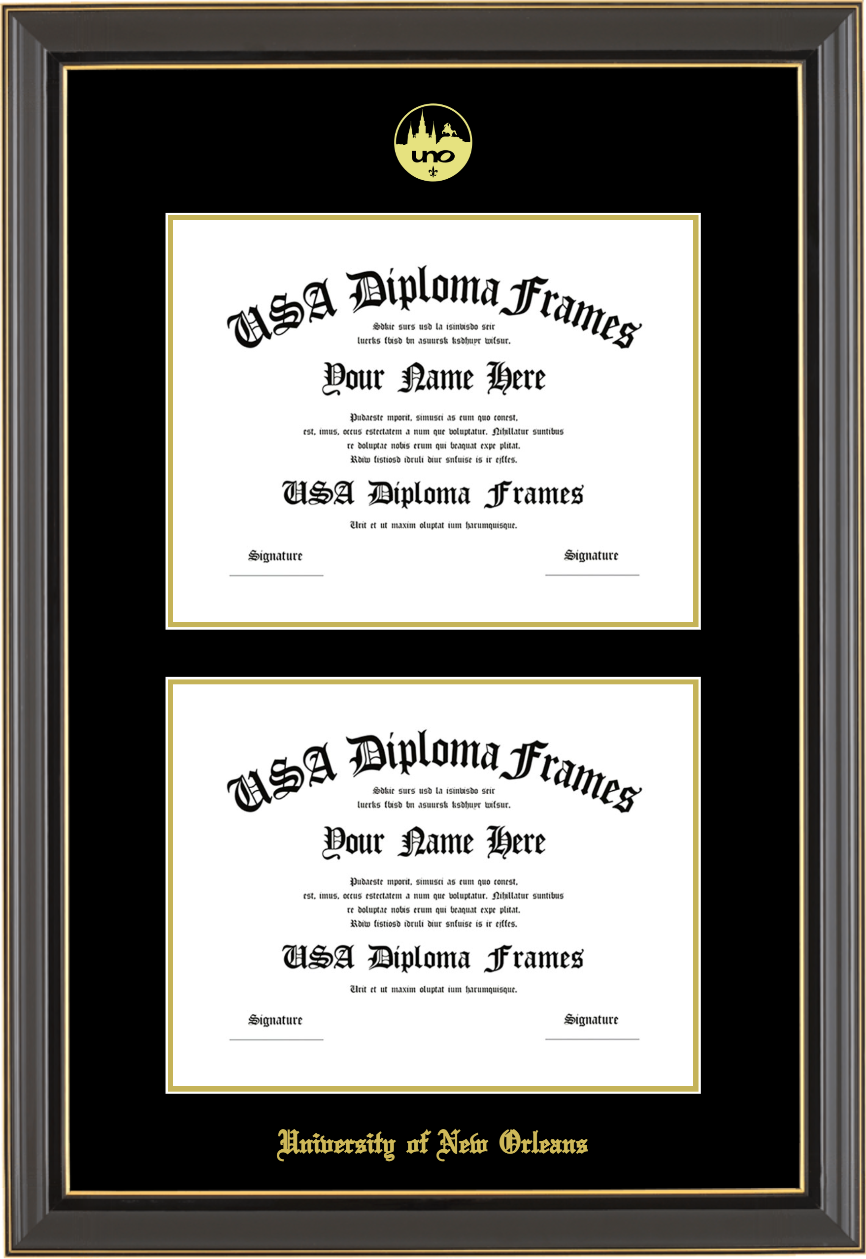 University of New Orleans Double Diploma Frame – Double Document – Black Gold Trim Glossy – Black and Gold Mat