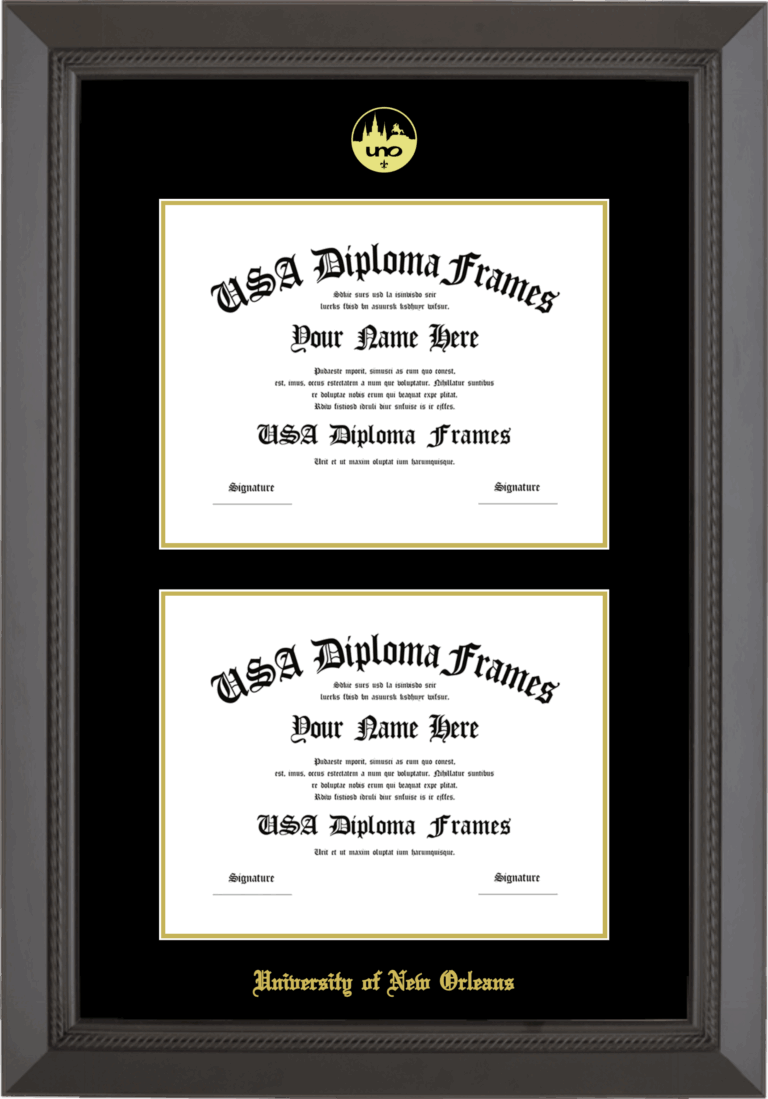 University of New Orleans Double Diploma Frame – Double Document – Black Rope – Black and Gold Mat