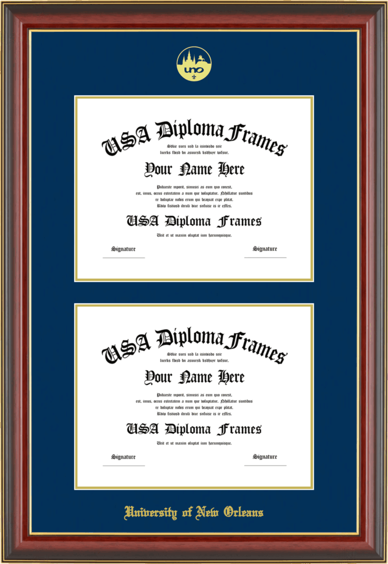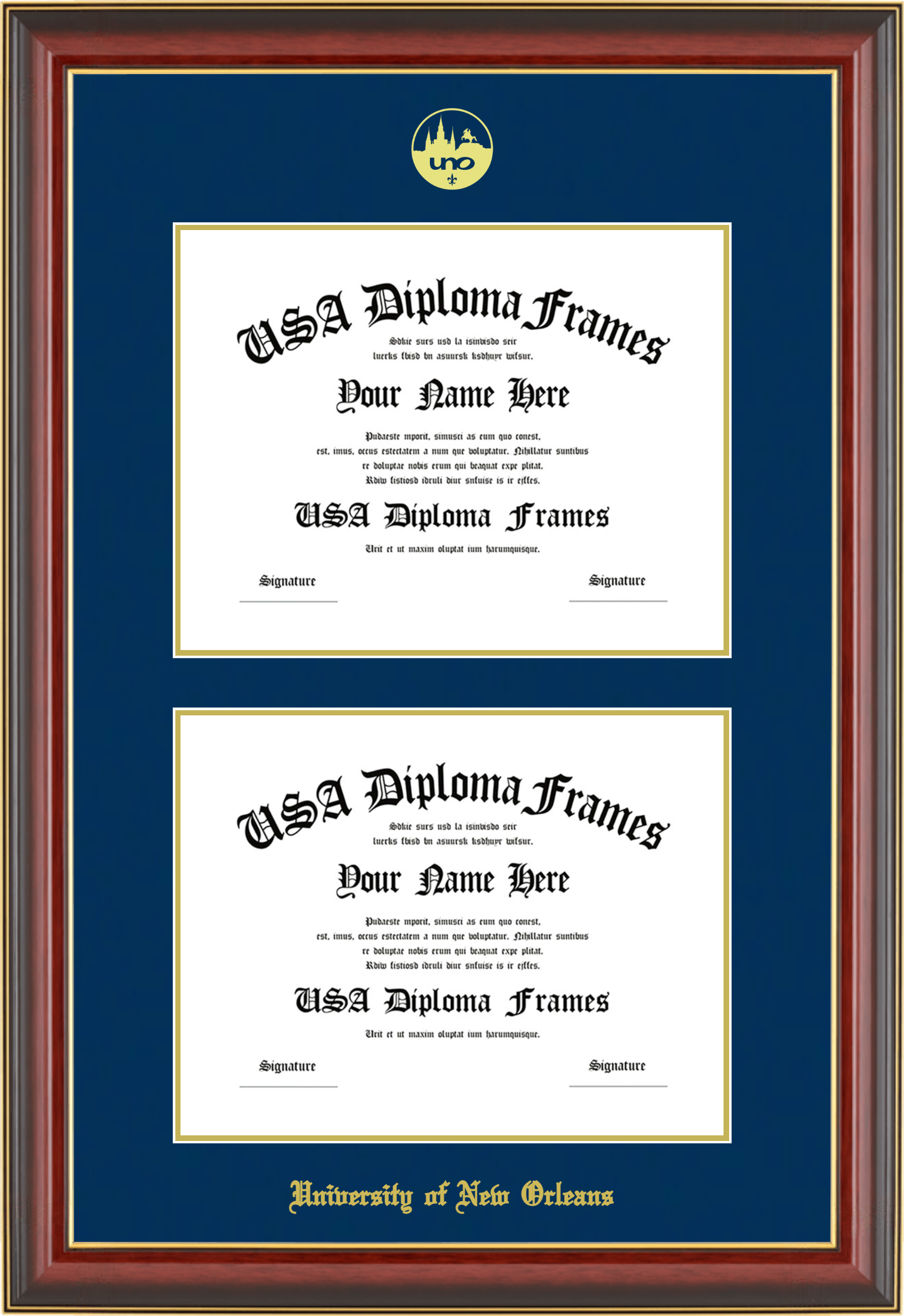 University of New Orleans Double Diploma Frame – Double Document – Cherry Mahogany Gold Trim Glossy – Navy and Gold Mat