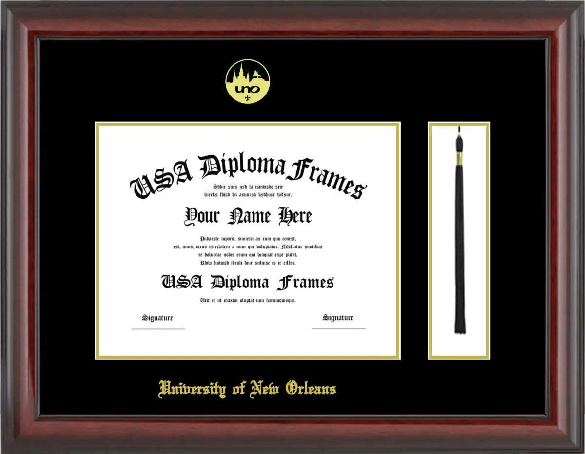 University of New Orleans – Single Horizontal Document ( 8 1/2″x11″ ) – Cherry Mahogany Glossy – Black Mat – Gold Accent Mat – With Tassel(Default) – With Seal(University Seal Gold) – With Gold Embossing (University of New Orleans)