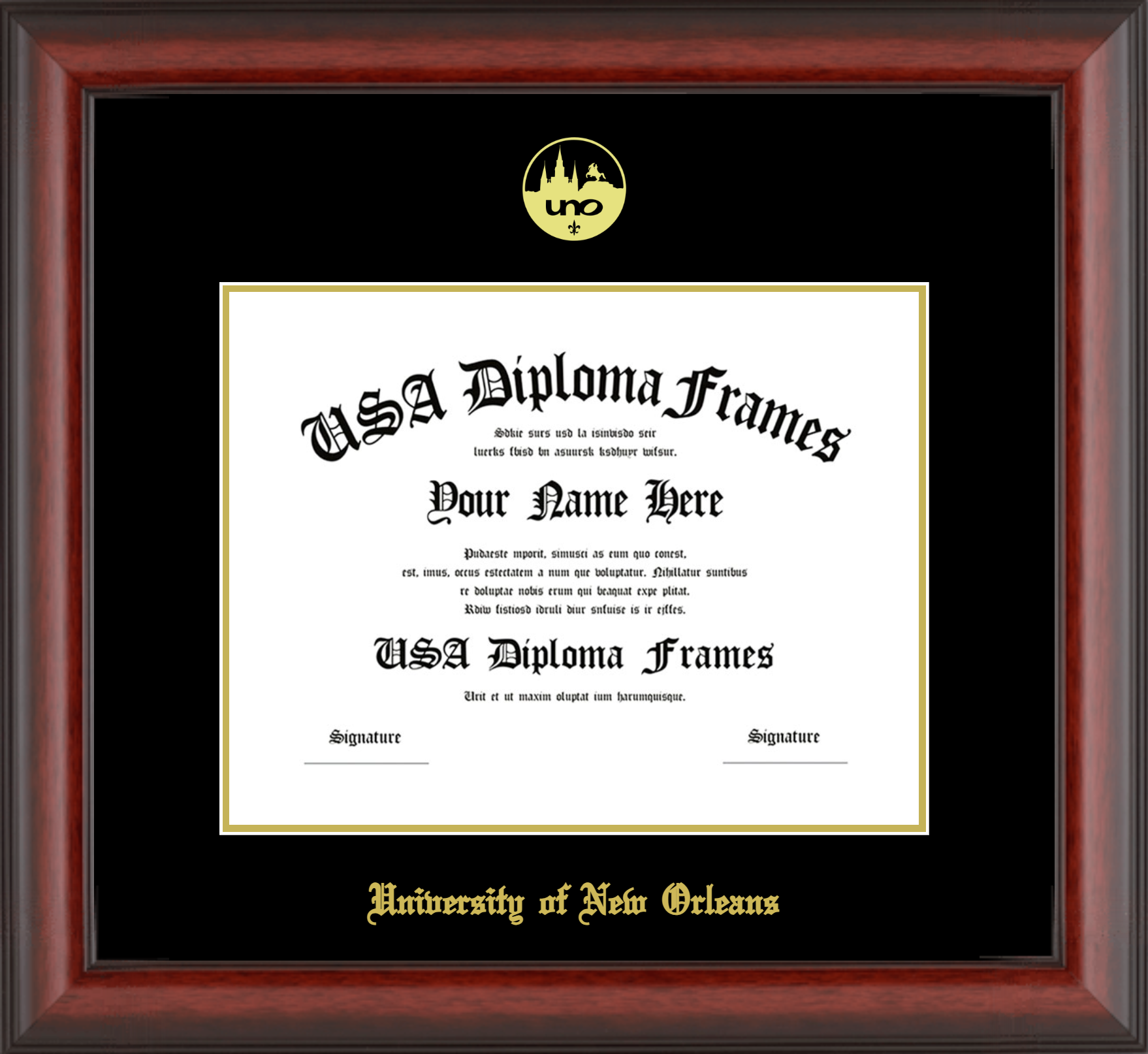 University of New Orleans – Single Horizontal Document ( 8 1/2″x11″ ) – Cherry Mahogany Matte – Black Mat – Gold Accent Mat – With Seal(University Seal Gold) – With Gold Embossing (University of New Orleans)