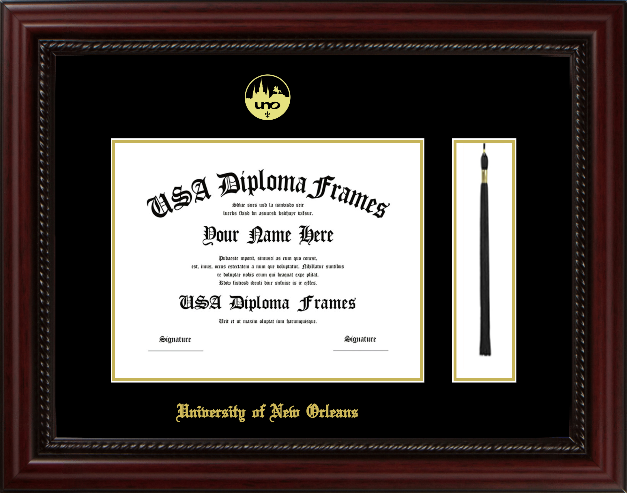 University of New Orleans Diploma Frame with Tassel – Executive Cherry Rope – Black and Gold Mat