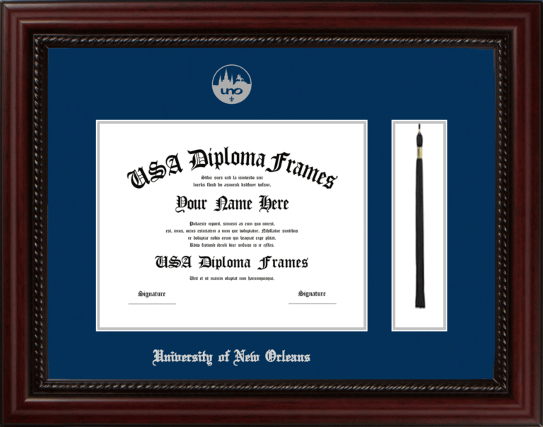University of New Orleans Diploma Frame with Tassel – Executive Cherry Rope – Navy and Silver Mat