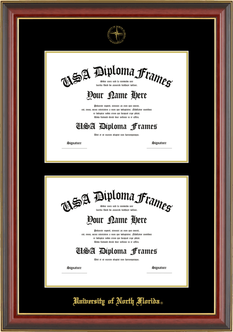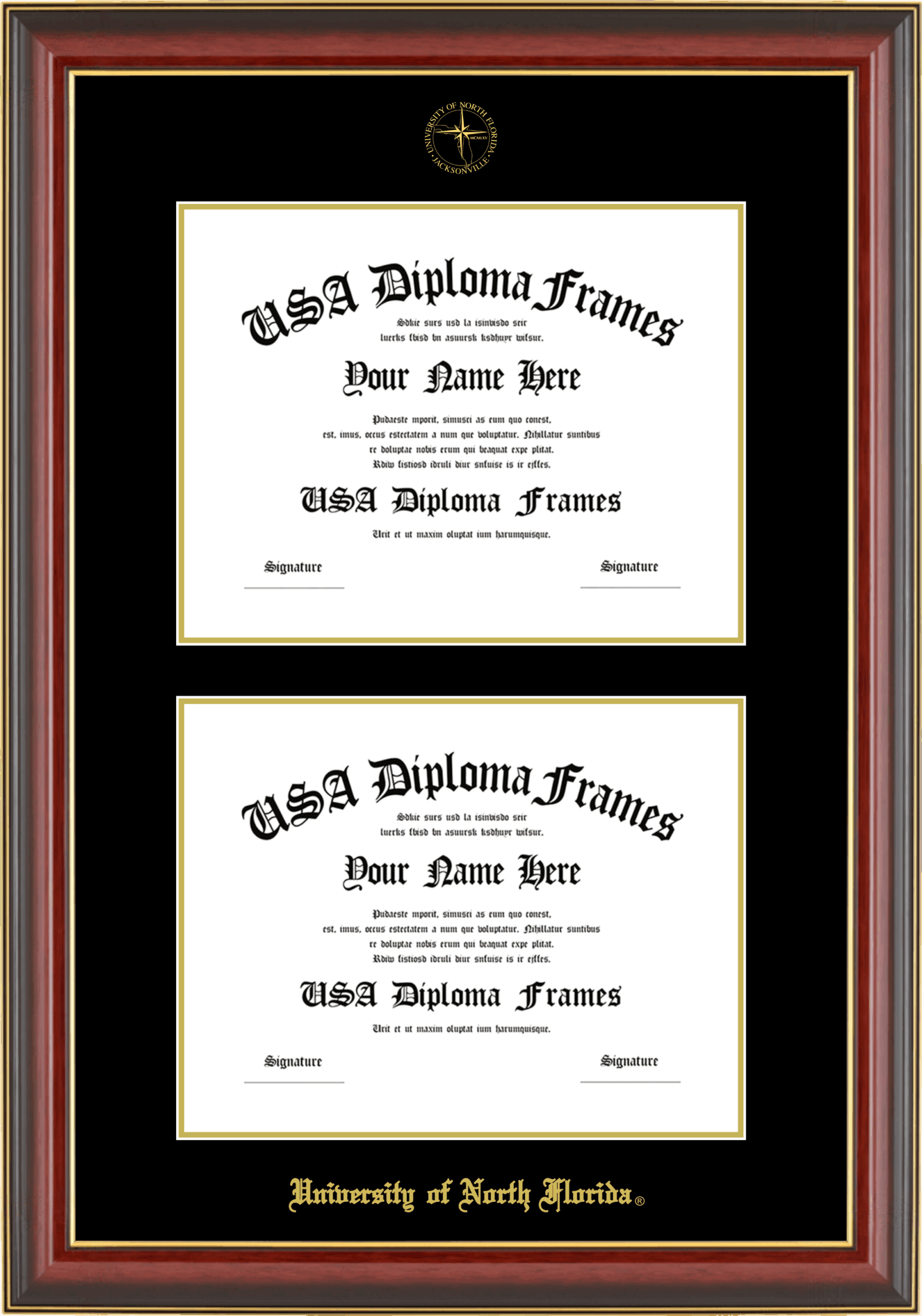 University of North Florida Double Diploma Frame – Double Document – Cherry Mahogany Gold Trim Glossy – Black and Gold Mat