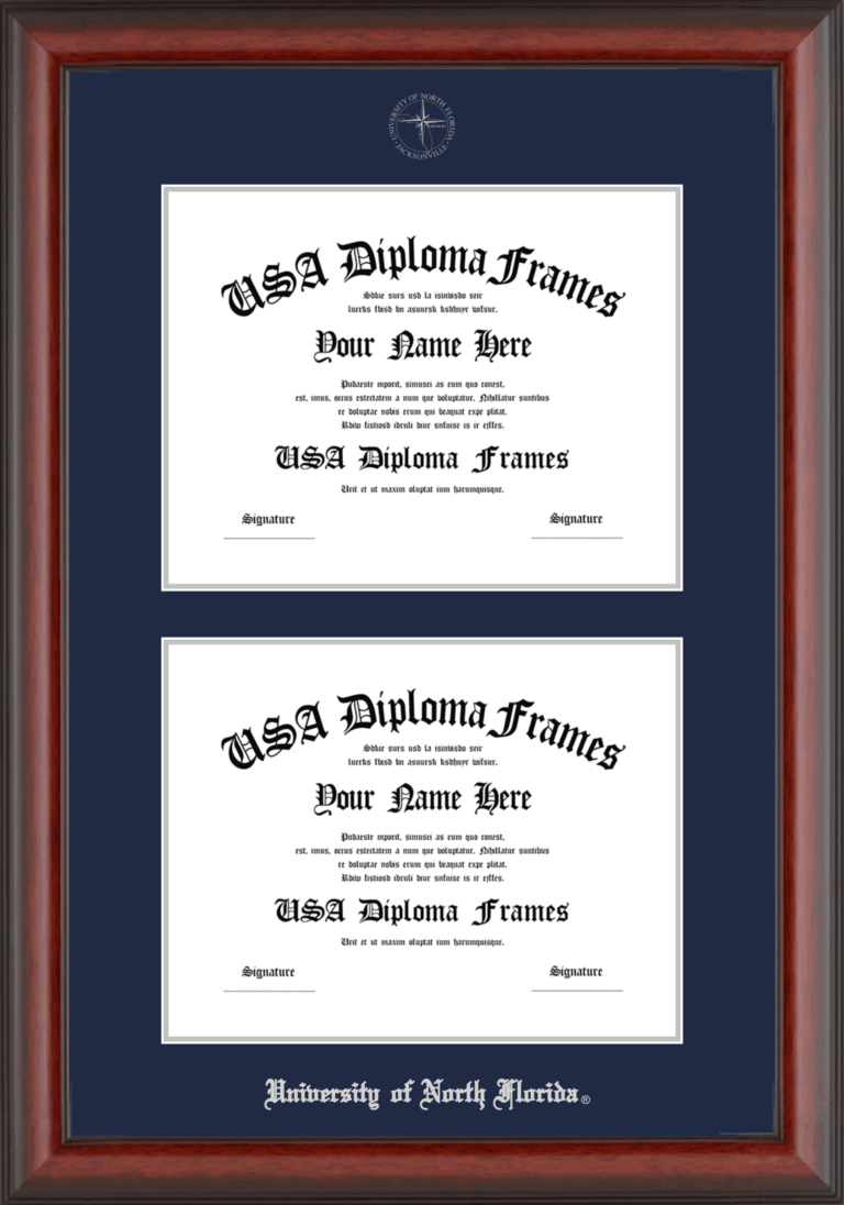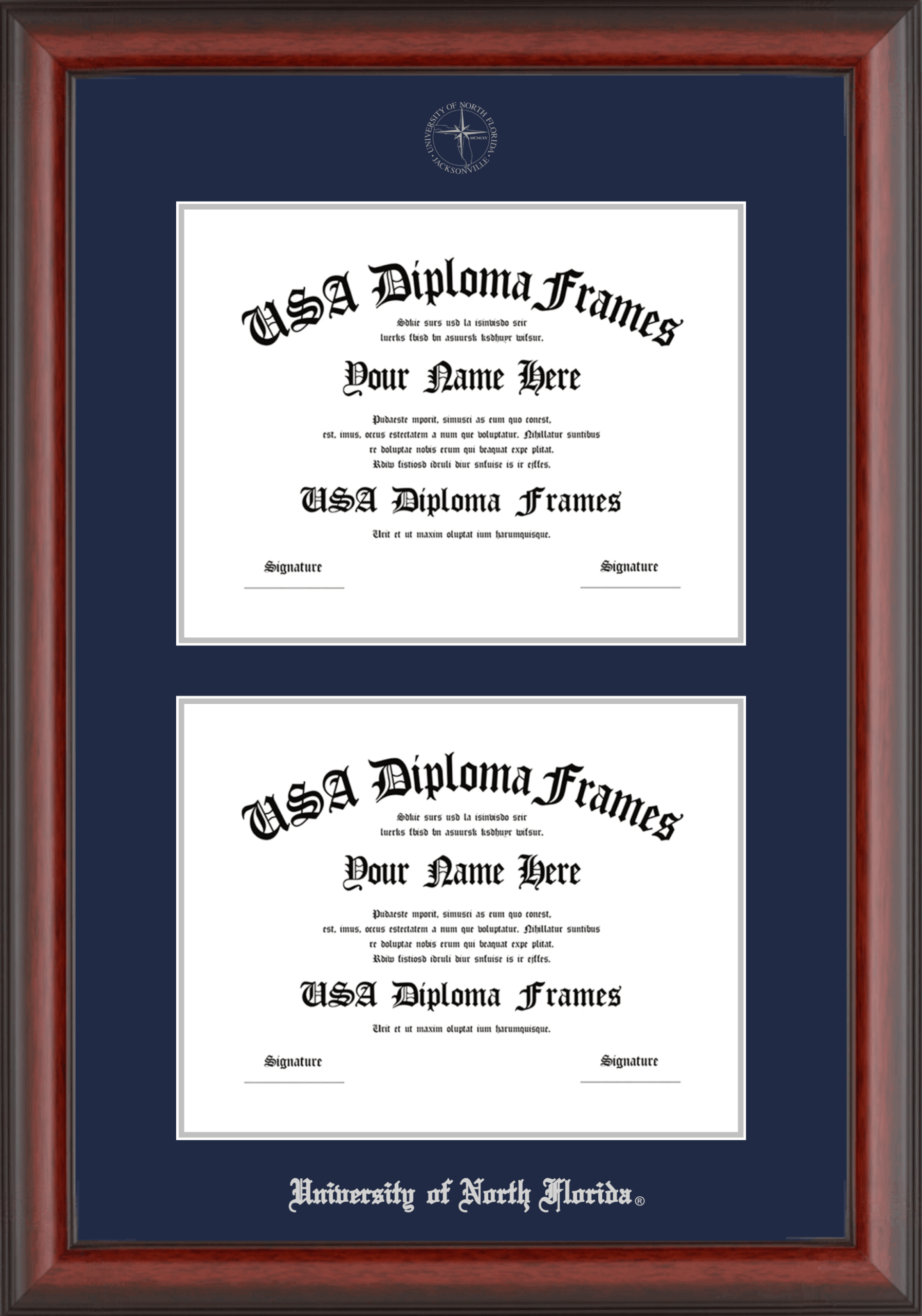 University of North Florida Double Diploma Frame – Double Document – Cherry Mahogany Matte – Navy and Silver Mat