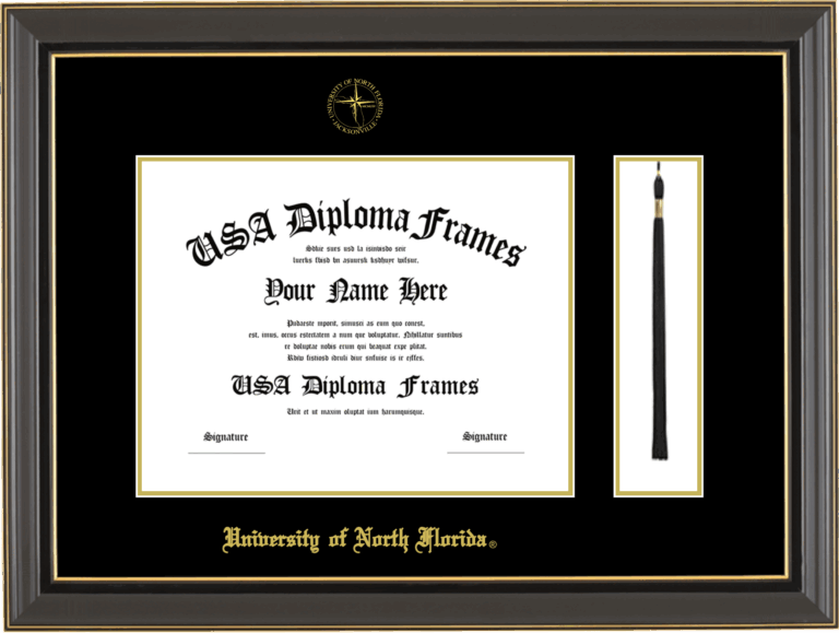 University of North Florida Diploma Frame with Tassel – Bachelors 8.5×11 – Black Gold Trim Glossy – Black and Gold Mat