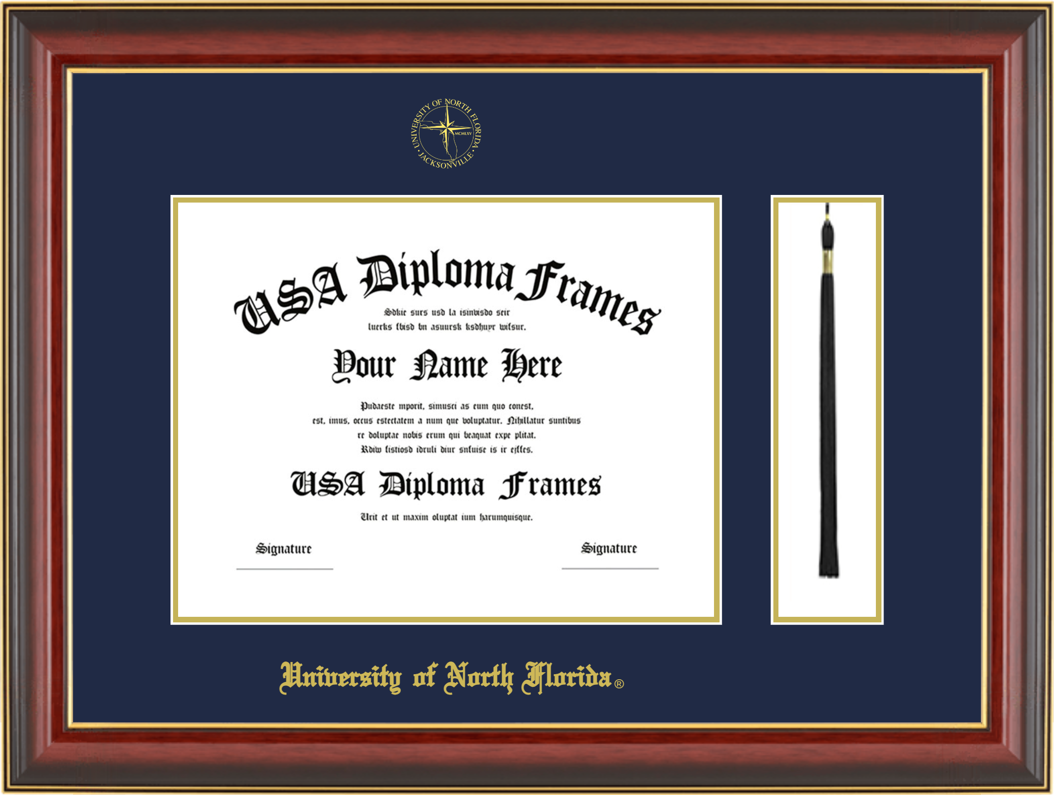 University of North Florida Diploma Frame with Tassel – Bachelors 8.5×11 – Cherry Mahogany Gold Trim Glossy – Navy and Gold Mat