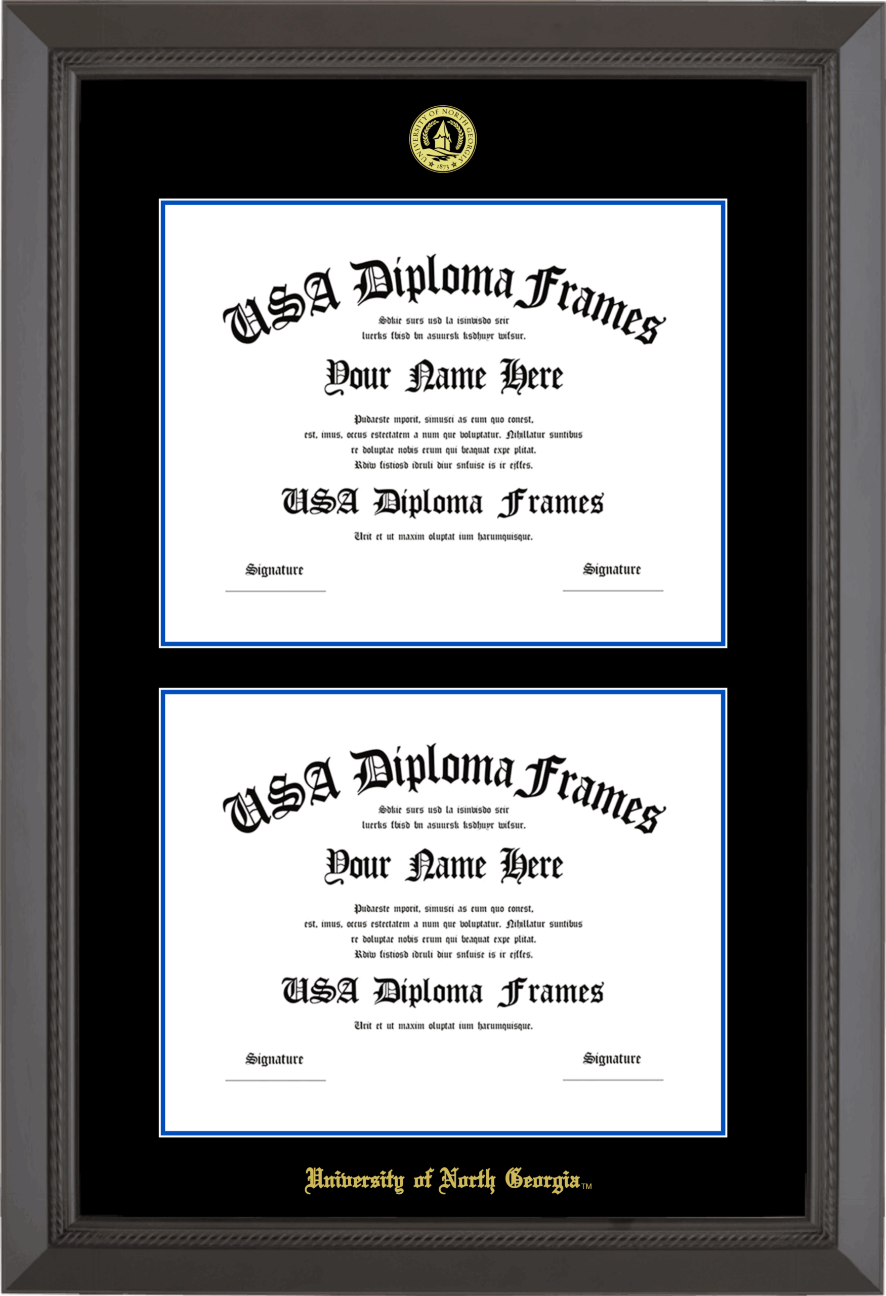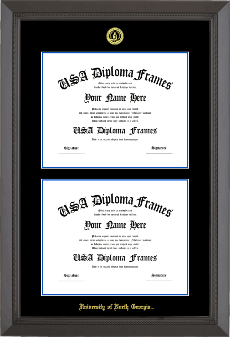 University of North Georgia Double Diploma Frame – Double Document – Black Rope – Black and Royal Blue Mat