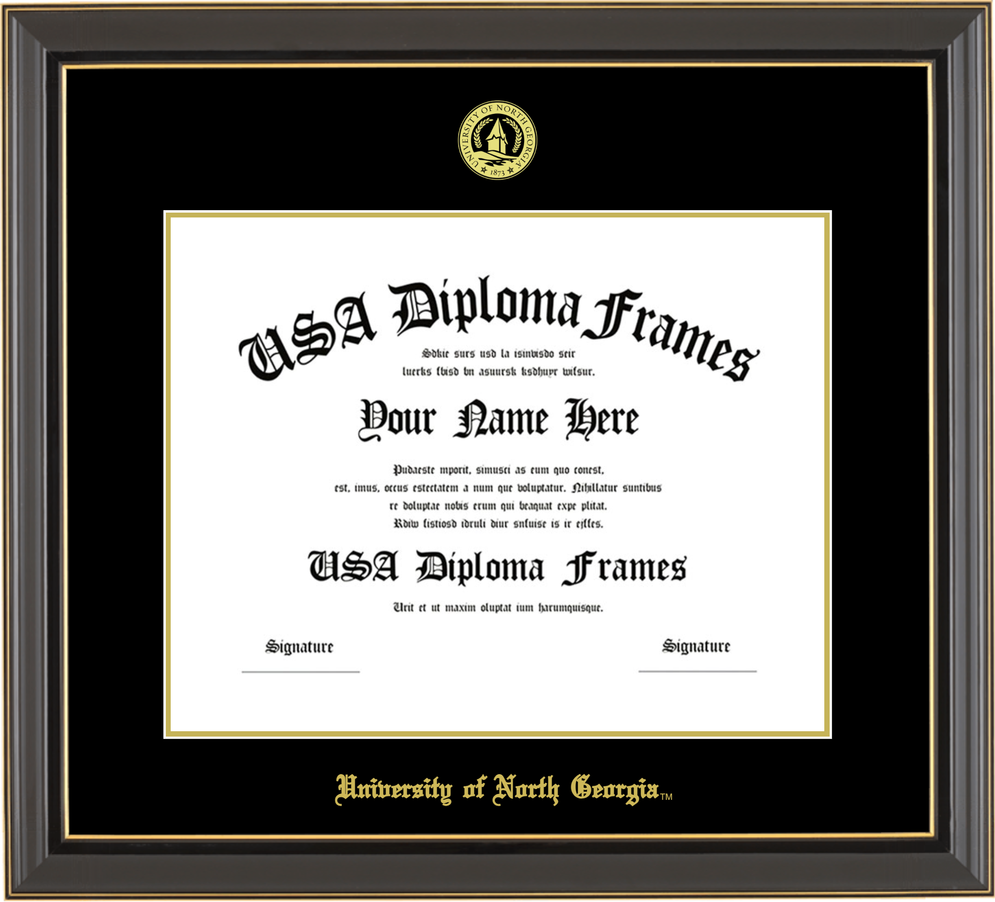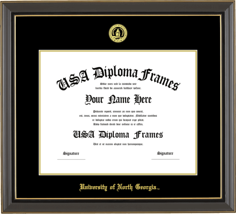 University of North Georgia Diploma Frame – Black Gold Trim Glossy – Black and Gold Mat