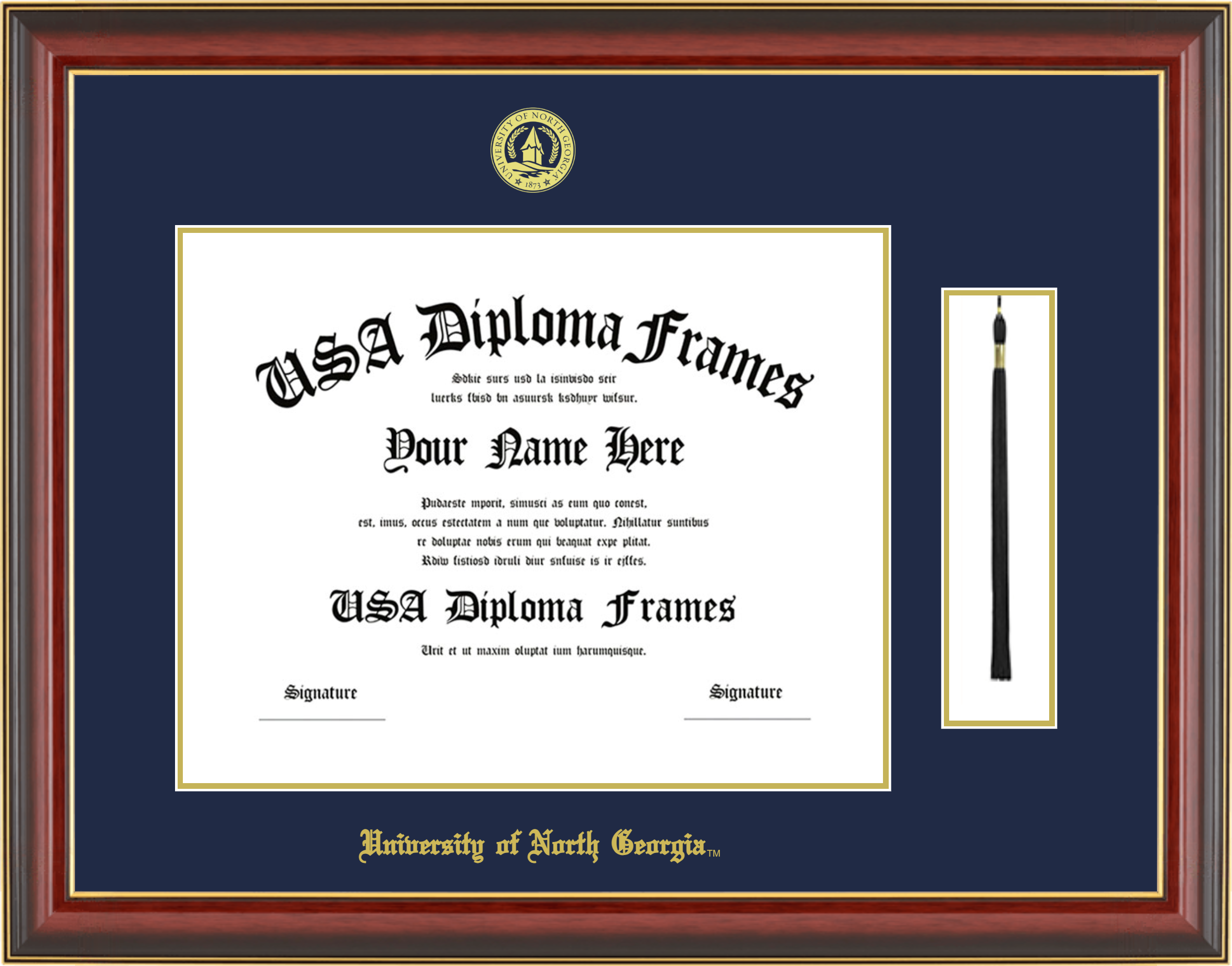 University of North Georgia Diploma Frame with Tassel – Cherry Mahogany Gold Trim Glossy – Navy and Gold Mat