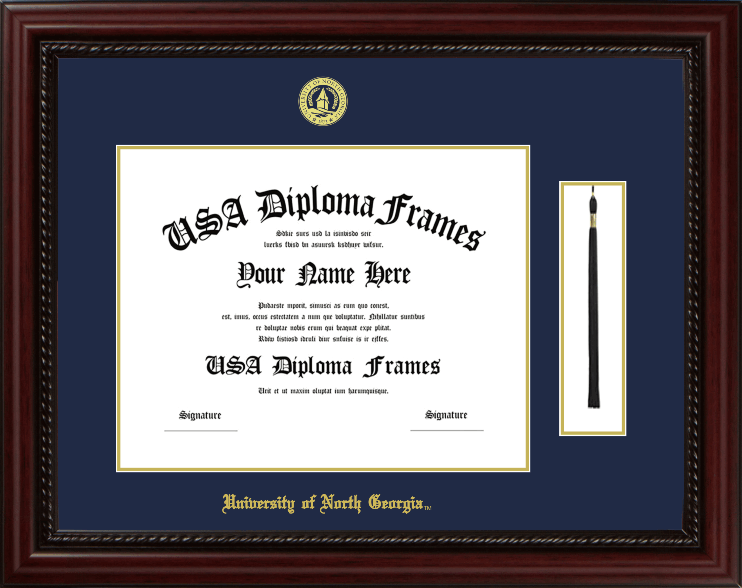 University of North Georgia Diploma Frame with Tassel – Executive Cherry Rope – Navy and Gold Mat