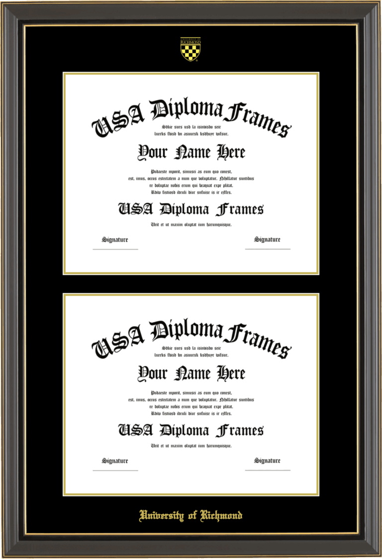 University of Richmond Double Diploma Frame – Double Document – Black Gold Trim Glossy – Black and Gold Mat