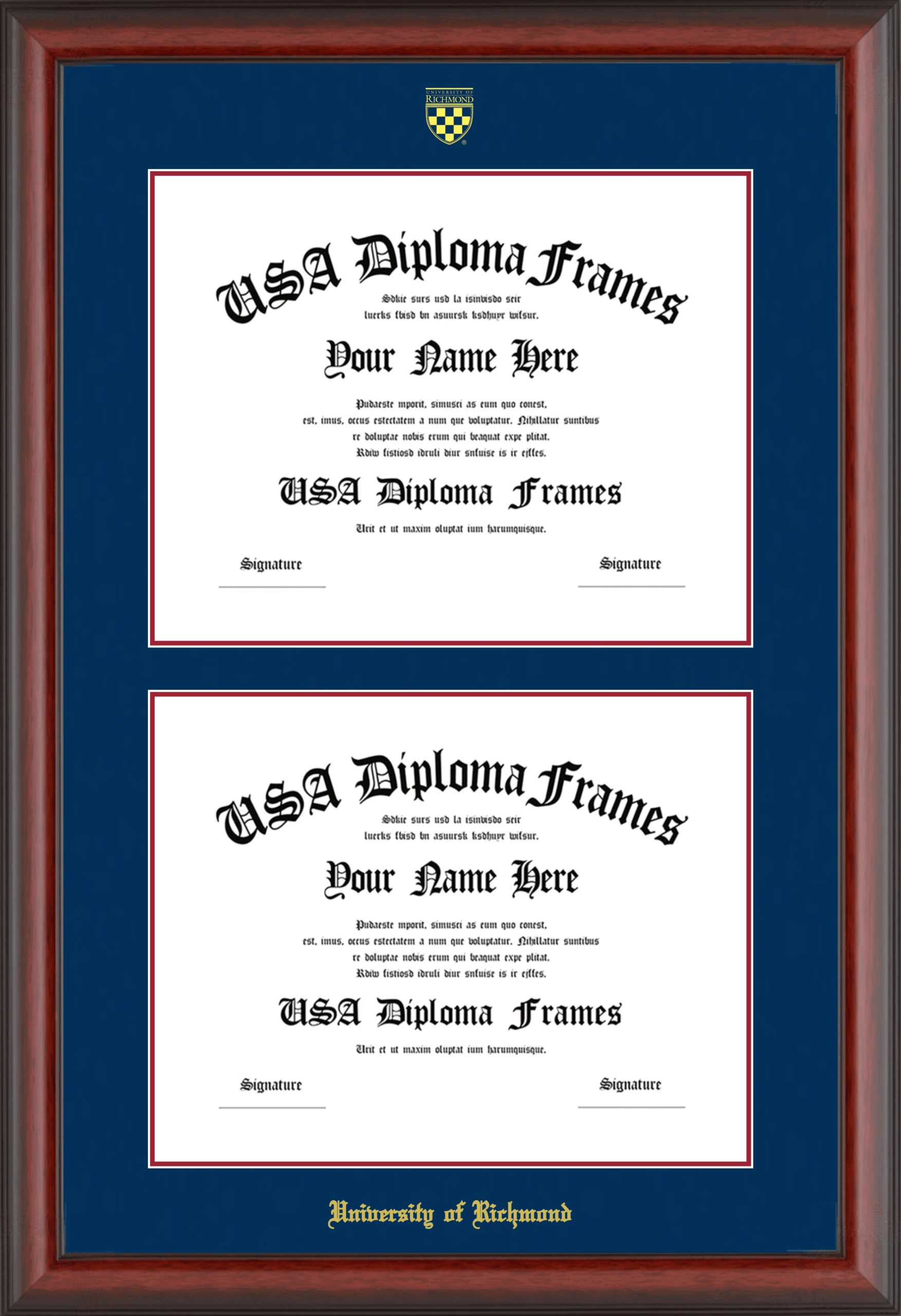 University of Richmond Double Diploma Frame – Double Document – Cherry Mahogany Matte – Navy and Crimson Mat
