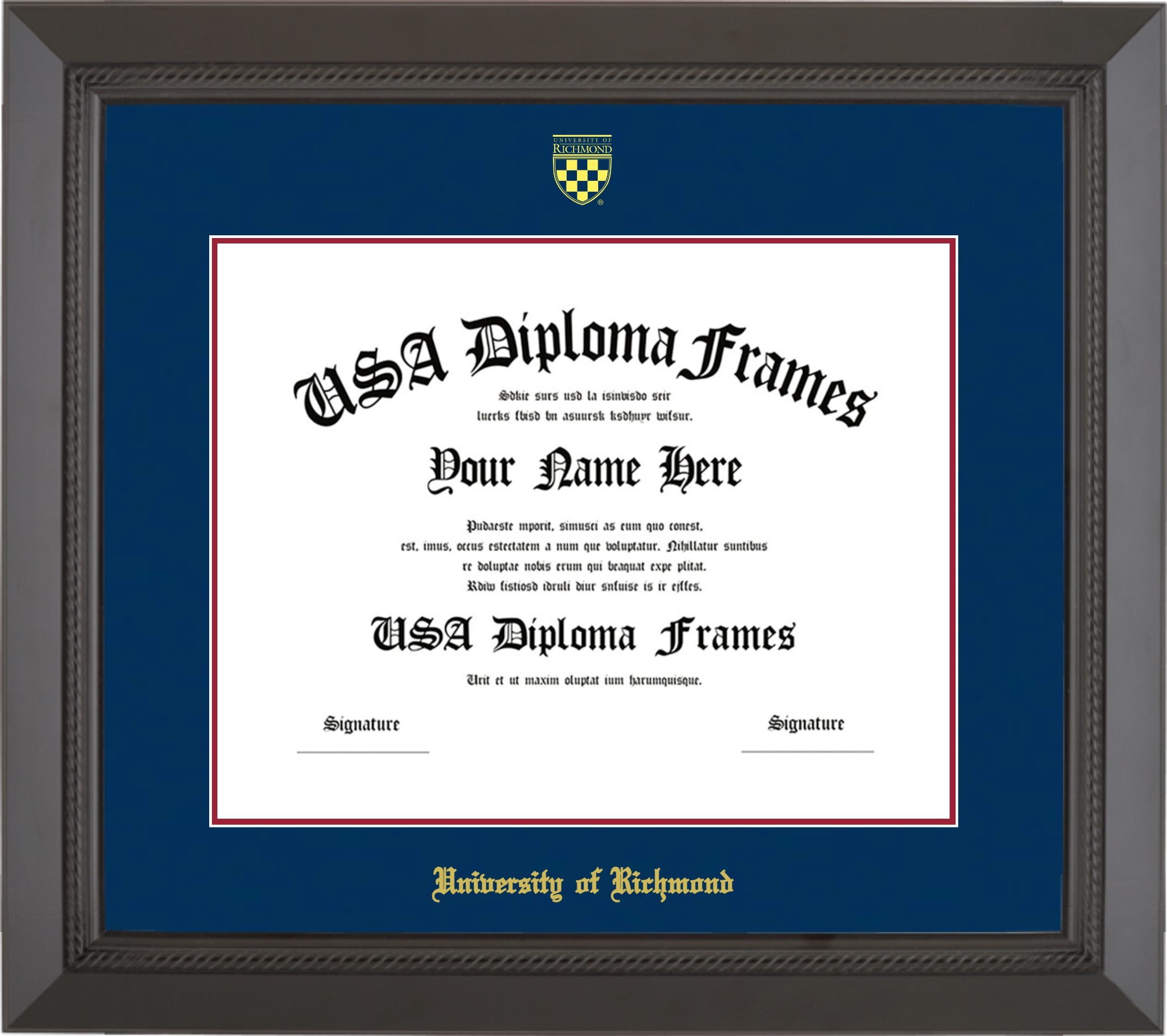University of Richmond Diploma Frame – Black Rope – Navy and Crimson Mat
