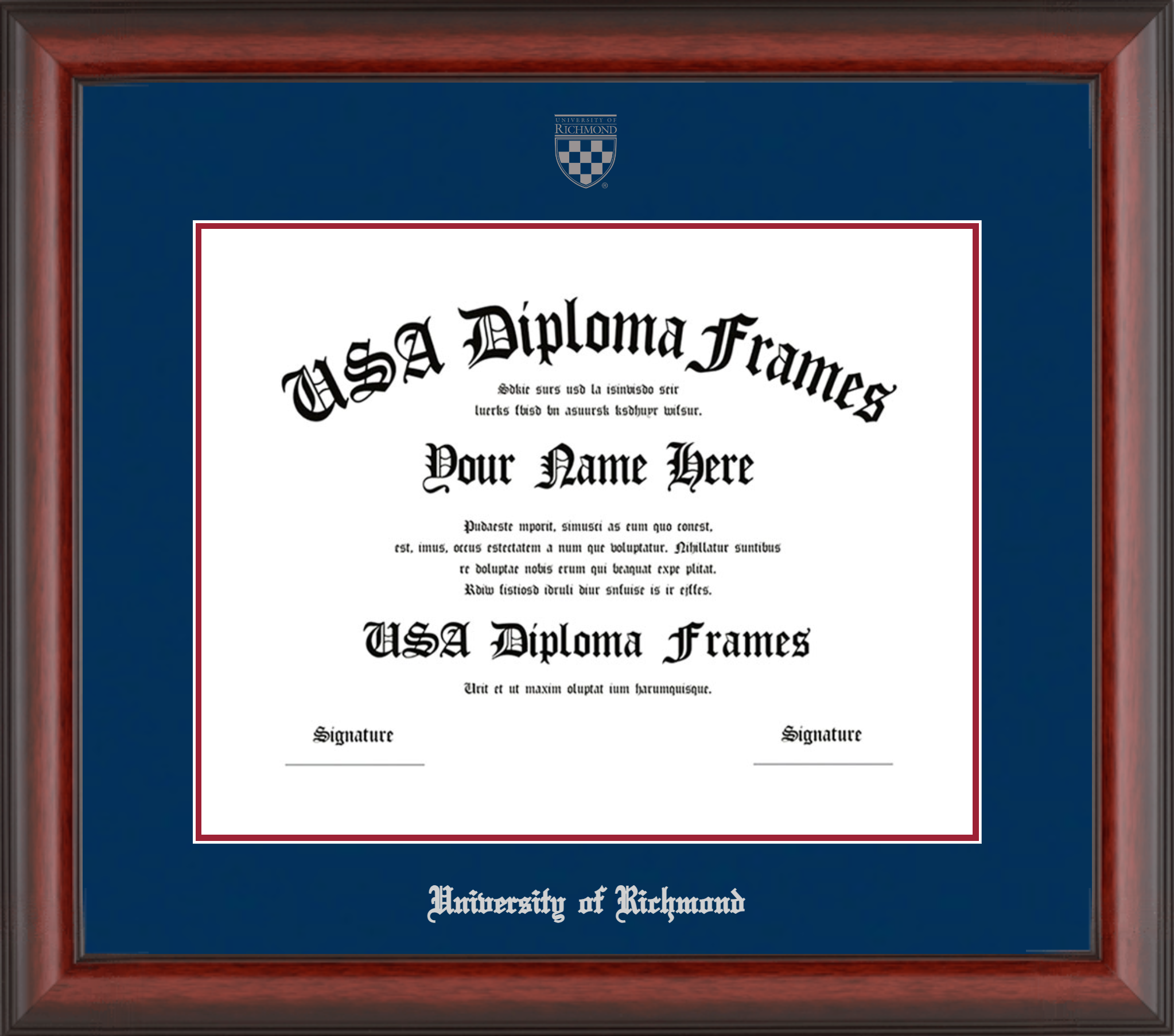 University of Richmond Diploma Frame – Cherry Mahogany Matte – Navy and Crimson Mat – Silver Seal