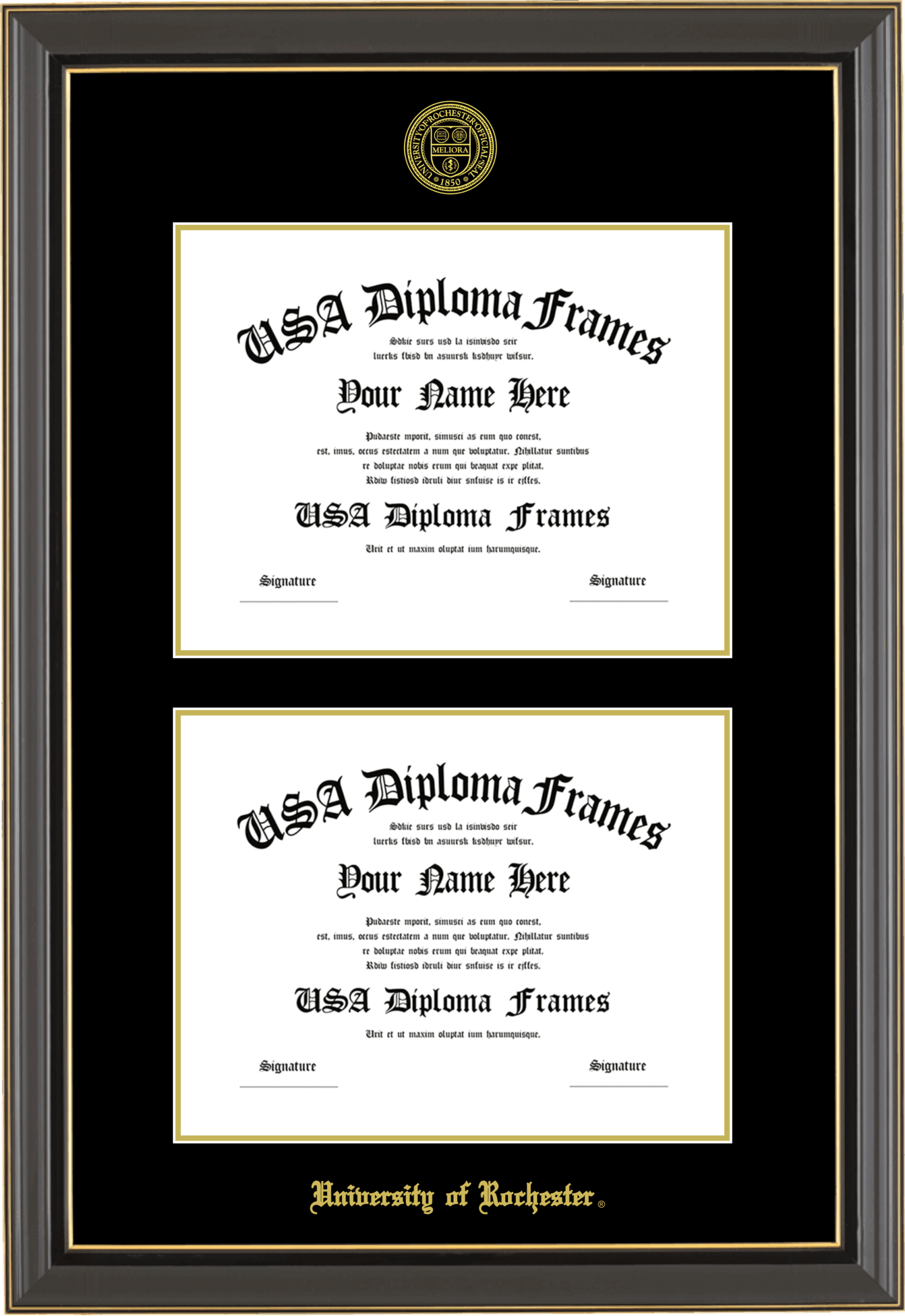 University of Rochester Double Diploma Frame – Double Document – Black Gold Trim Glossy – Black and Gold Mat
