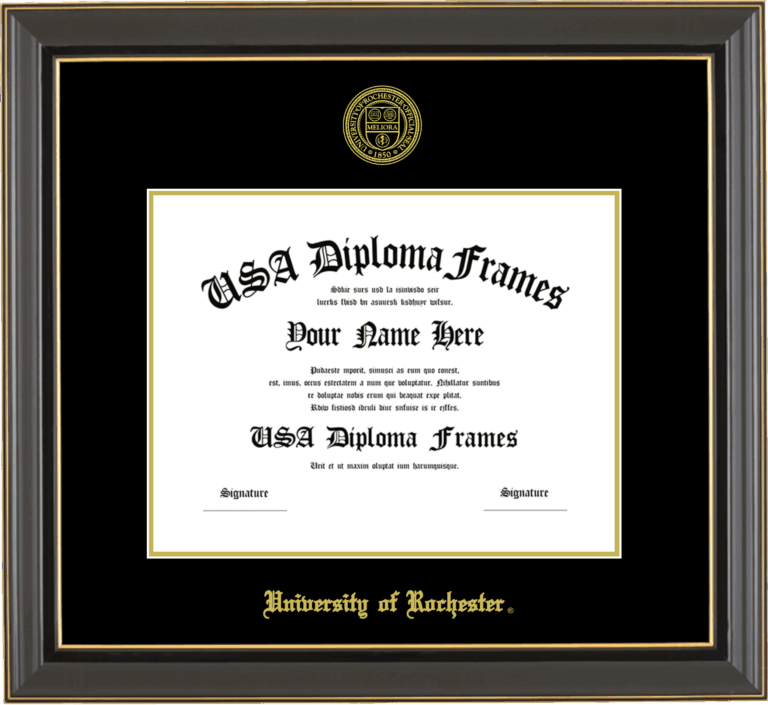 University of Rochester Diploma Frame – Black Gold Trim Glossy – Black and Gold Mat