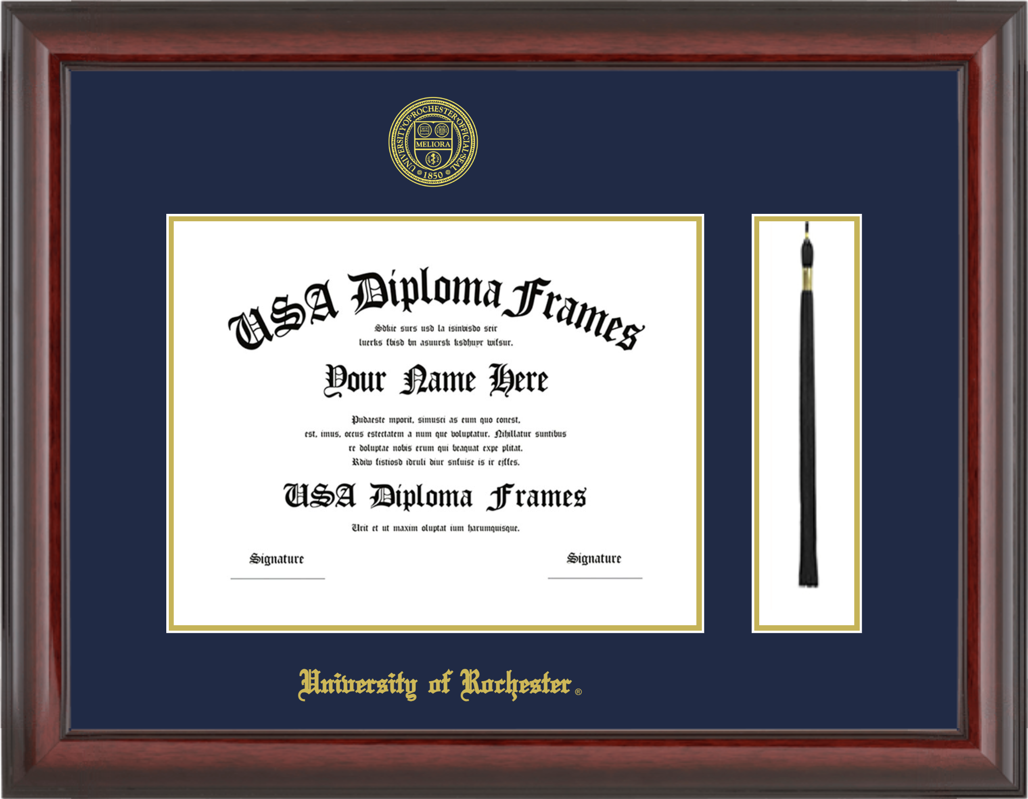 University of Rochester Diploma Frame with Tassel – Cherry Mahogany Glossy – Navy and Gold Mat