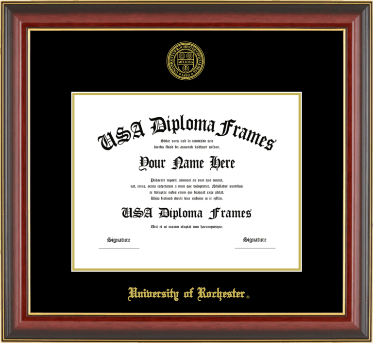 University of Rochester Diploma Frame – Cherry Mahogany Gold Trim Glossy – Black and Gold Mat