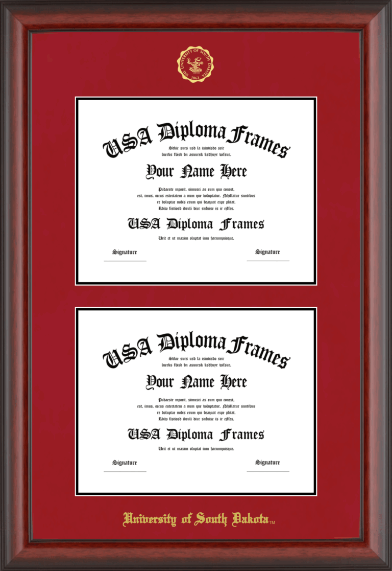 Want to explore more styles? Browse our full range of diploma frame layouts, or visit the University of South Dakota to view options available for your school. Looking for a fully personalized design? Try our custom Frame Builder and create a frame that’s uniquely yours.