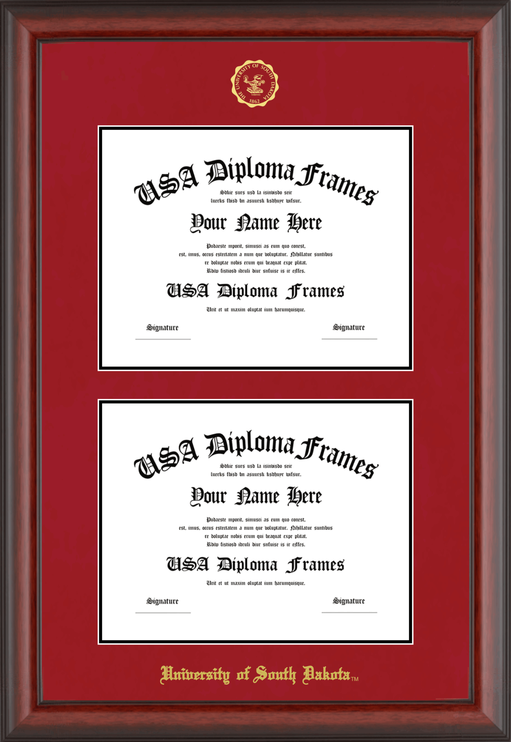 University of South Dakota Double Diploma Frame – Double Document – Cherry Mahogany Matte – Crimson and Black Mat
